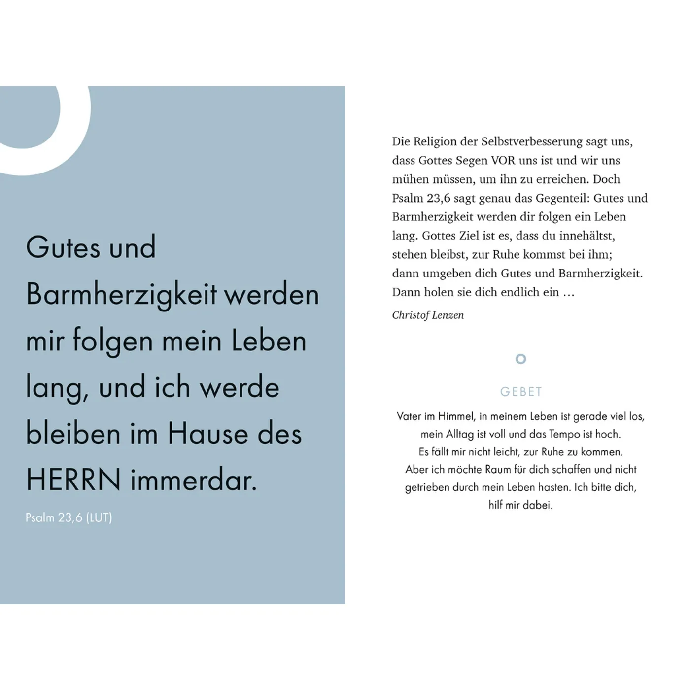 Das Buch hilft dabei, zwischen Arbeit, Terminen und Vorbereitungen kurz aufzutanken. Es holt einen dort ab, wo man gerade steht, und erinnert daran, dass Gott auch in den kleinen Momenten des Tages spürbar sein kann.