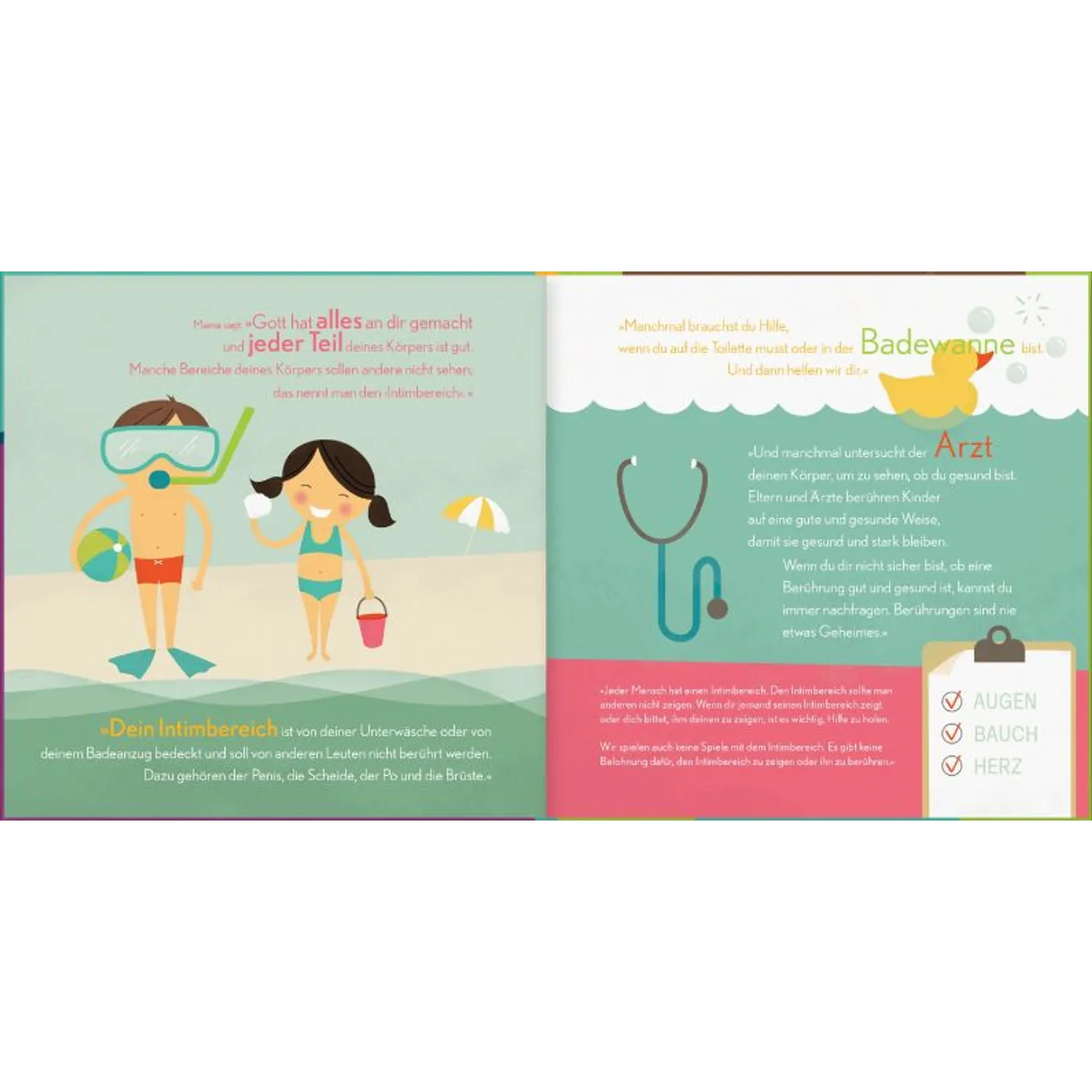 Das Wichtigste ist jedoch der Text und in dem wird mit vielen Bibelversen und einer kleinen Geschichte darauf hingewiesen das der ganze Körper von Gott geschaffen wurde. Es wird über angemessene und unangebrachte Berührungen gesprochen und Kinder dürfen verstehen das sie nicht jeden Kontakt zulassen müssen sondern "NEIN" sagen dürfen. Es geht darum Berührungen einzuordnen und dadurch unangebrachten und übergriffigen Körperkontakt zu erkennen um sich dann den Eltern oder anderen Vertrauenspersonen zu offenbaren und Hilfe zu bekommen.