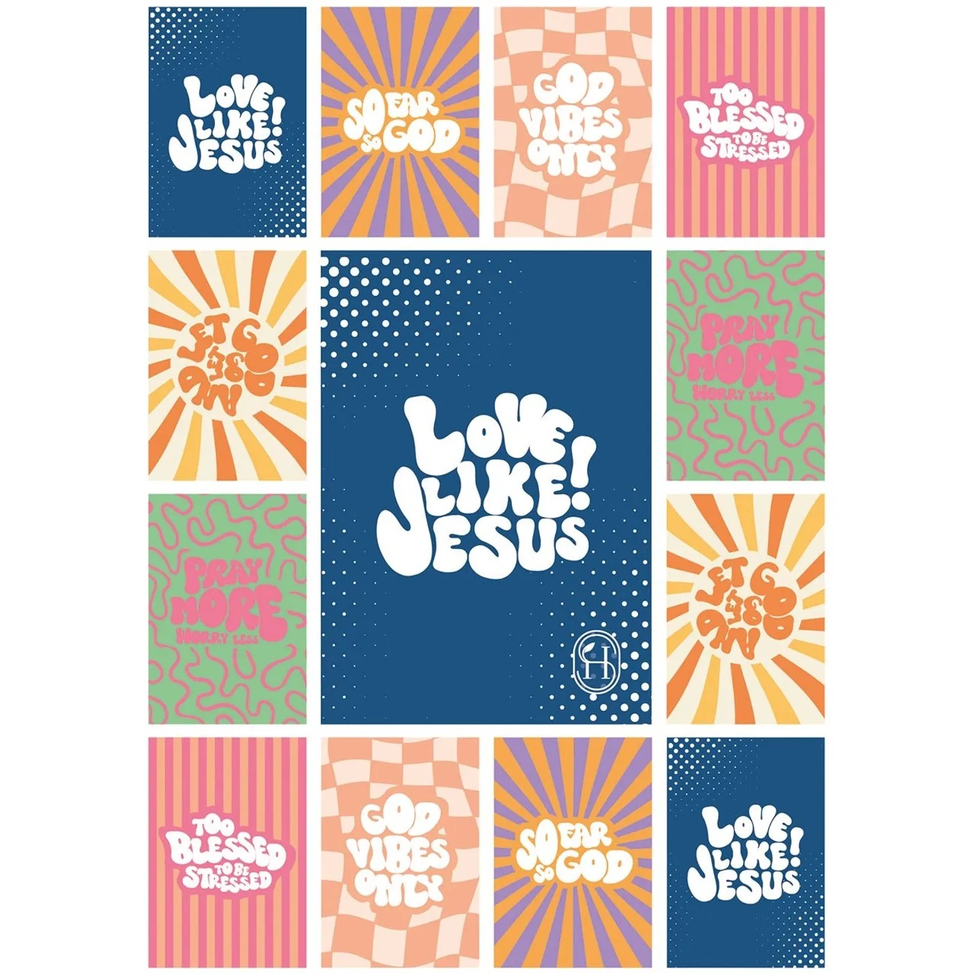 Modern gestaltete Sticker-Karte mit kreativen, humorvollen Glaubens-Statements – ausdrucksstark, fröhlich, mit klarer Botschaft