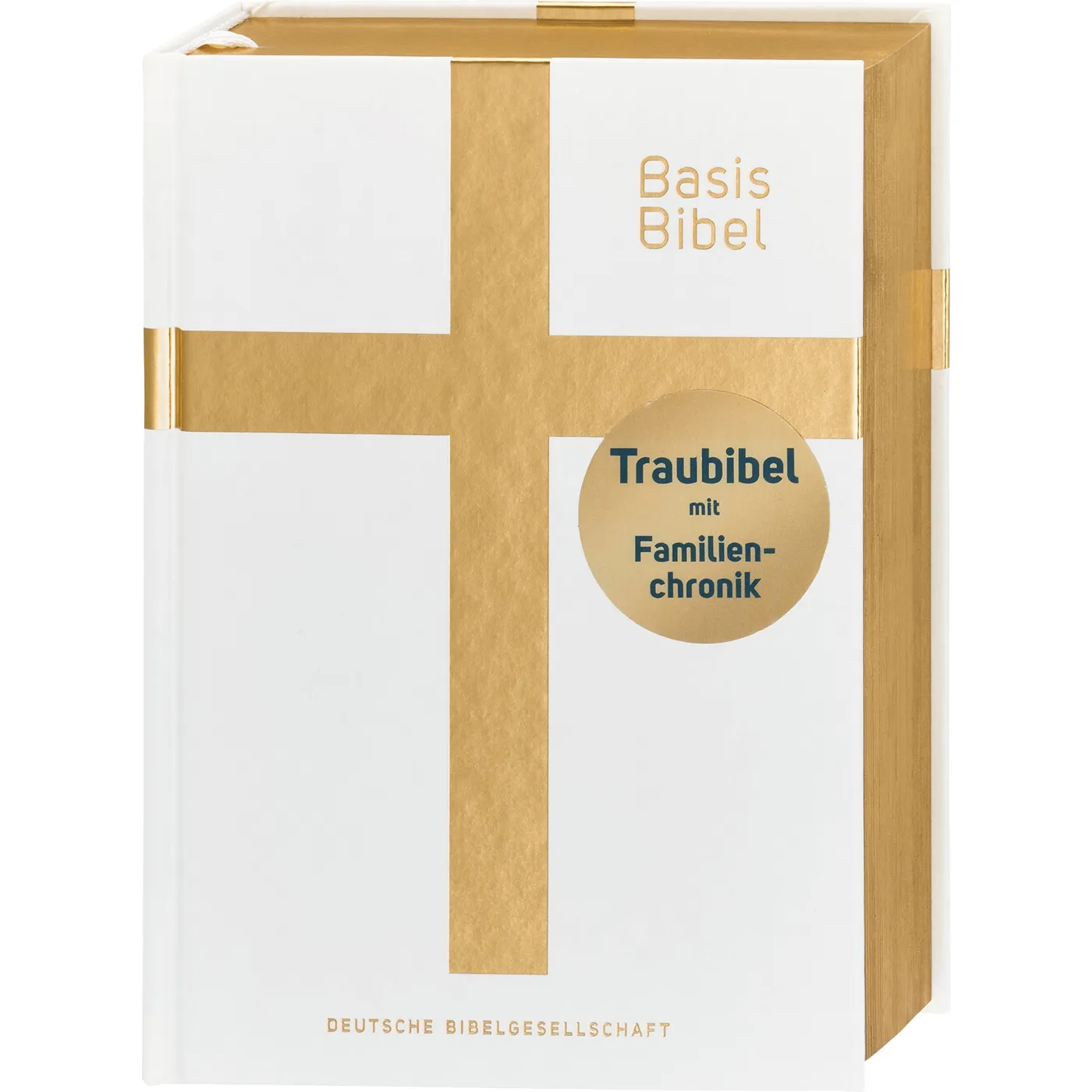 Die Basis Bibel in der Edition Traubibel ist die Basis Bibel der Deutschen Bibelgesellschaft in einer wunderschönen edlen Ausgabe mit weißem Cover mit goldenem Kreuz und Goldschnitt. Das Buch enthält am Ende eine Familienchronik zum Ausfüllen und ein Widmungsblatt. Daher eignet es sich gut als Hochzeitsgeschenk und als Familienbibel für ein