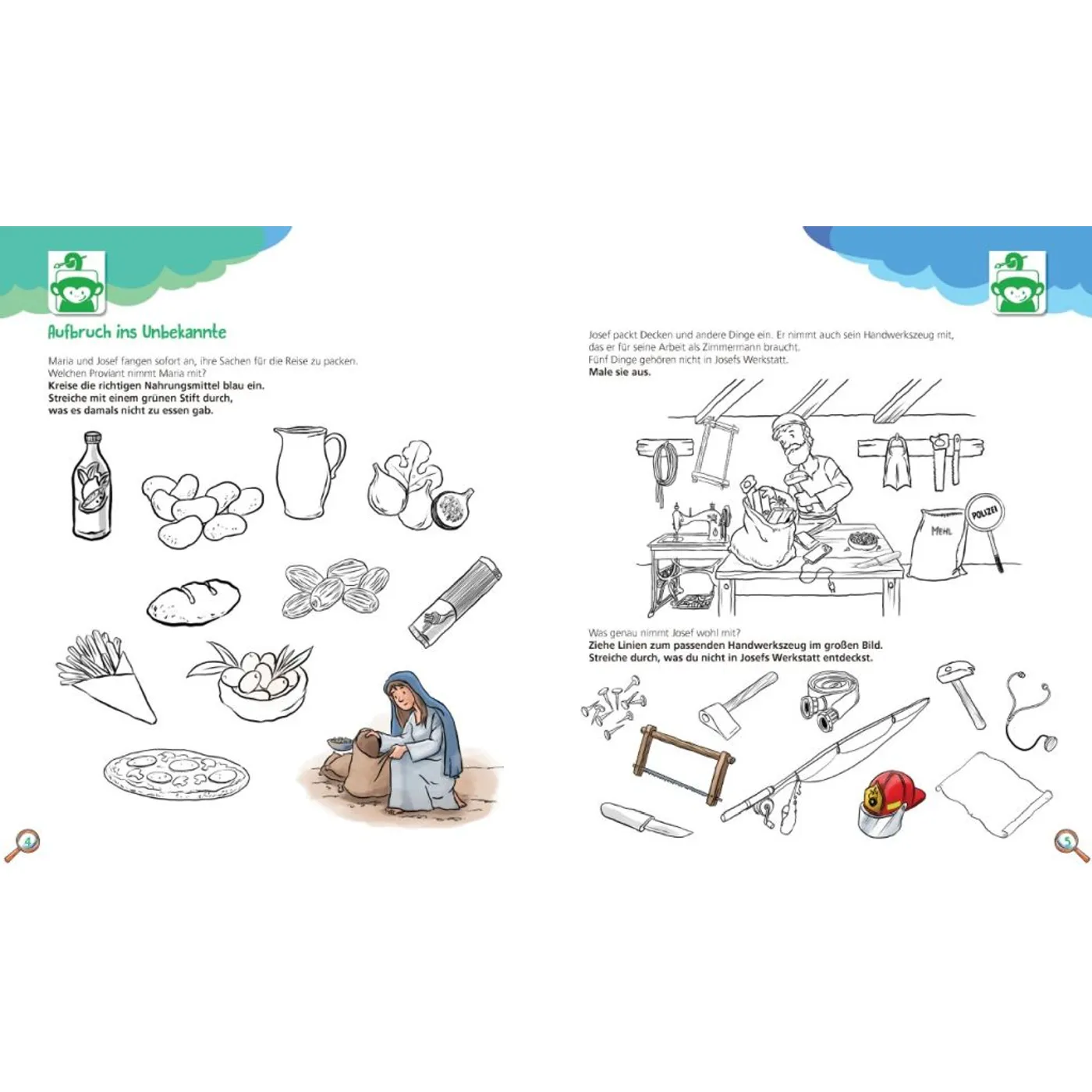 Durch Labyrinthe, Such- und Malbilder, Fehler finden, Zuordnungsaufgaben und vieles mehr entdecken sie die Geschichte von Jesu Geburt auf kreative und unterhaltsame Weise.