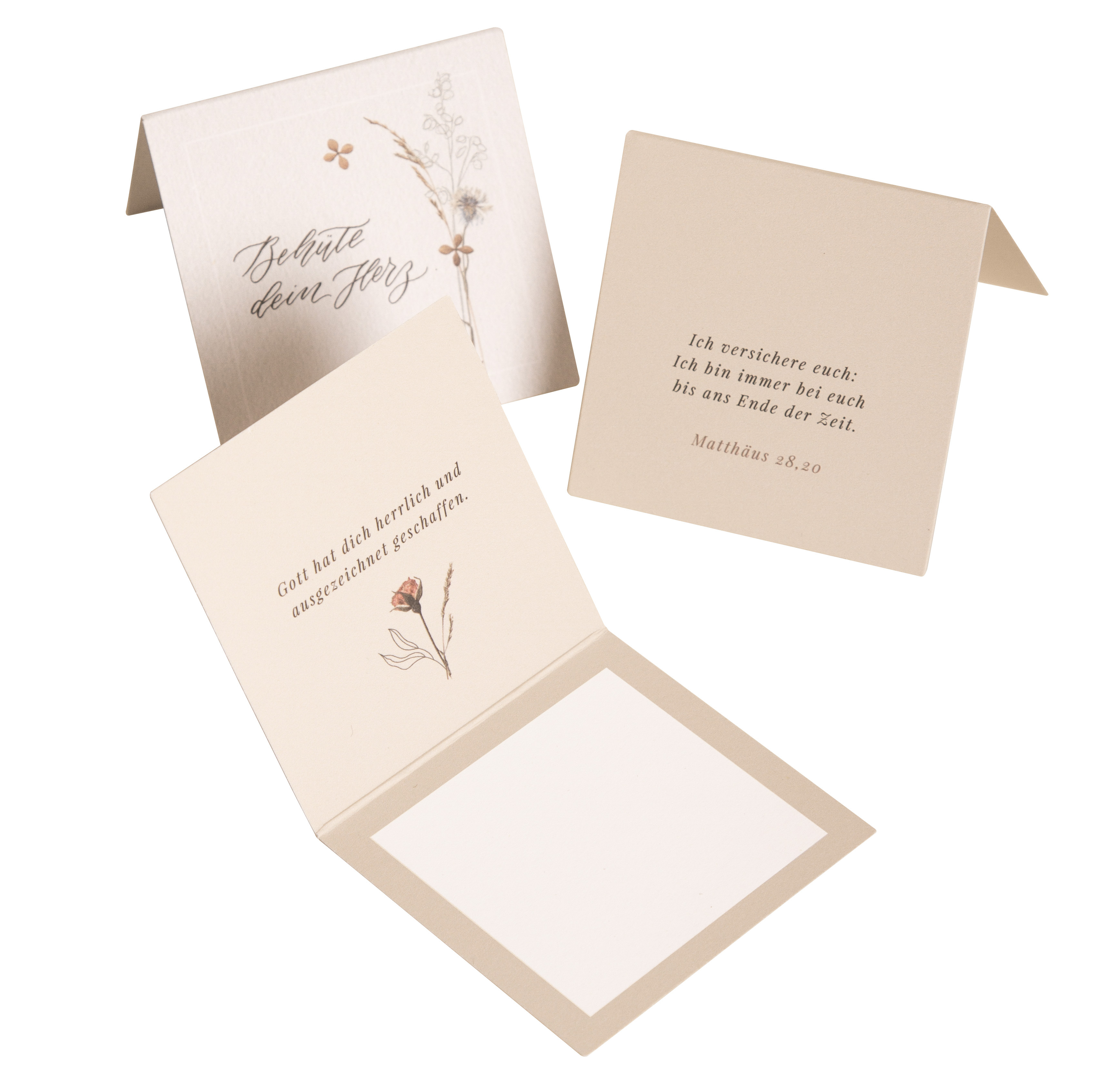 Besondere Kärtchen voller blühender Worte. Für die Vorderseiten hat Jeannette Mokosch Worte und Ermutigungen kalligrafiert, auf der Rückseite steht ein Bibelvers. Das Besondere: Die Kärtchen lassen sich aufstellen. Klappt man sie auf, entdeckt man im Inneren einen ermutigenden Gedanken und Platz für eine persönliche Botschaft, einen Wunsch oder einfach einen kleinen Gruß. Perfekt zum Weitergeben!