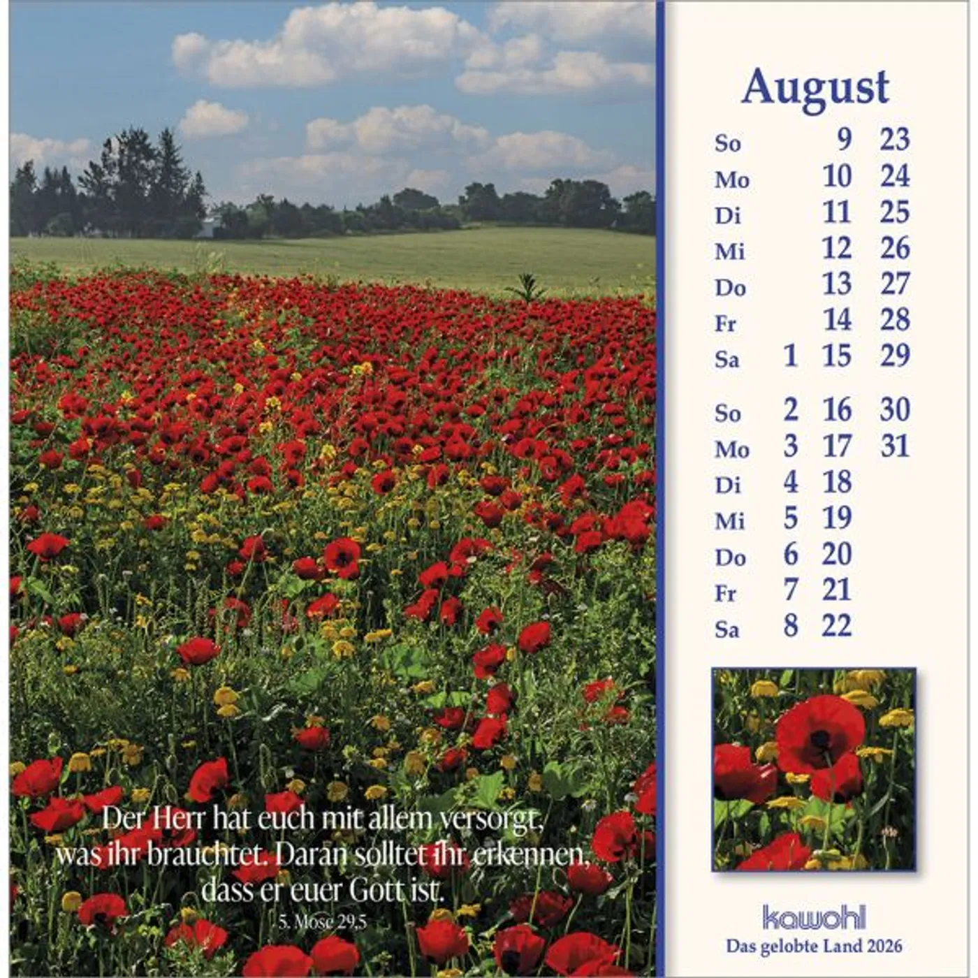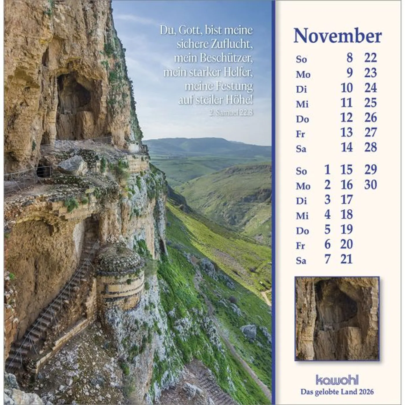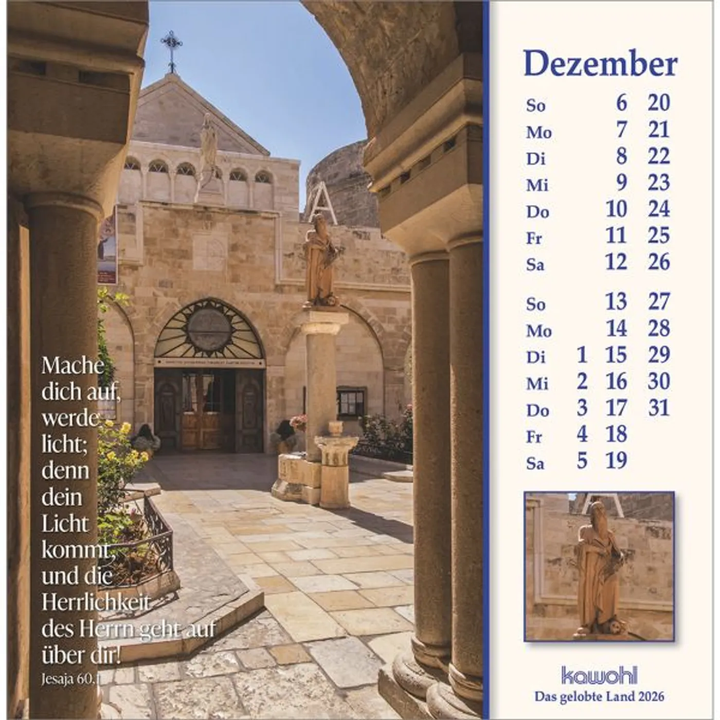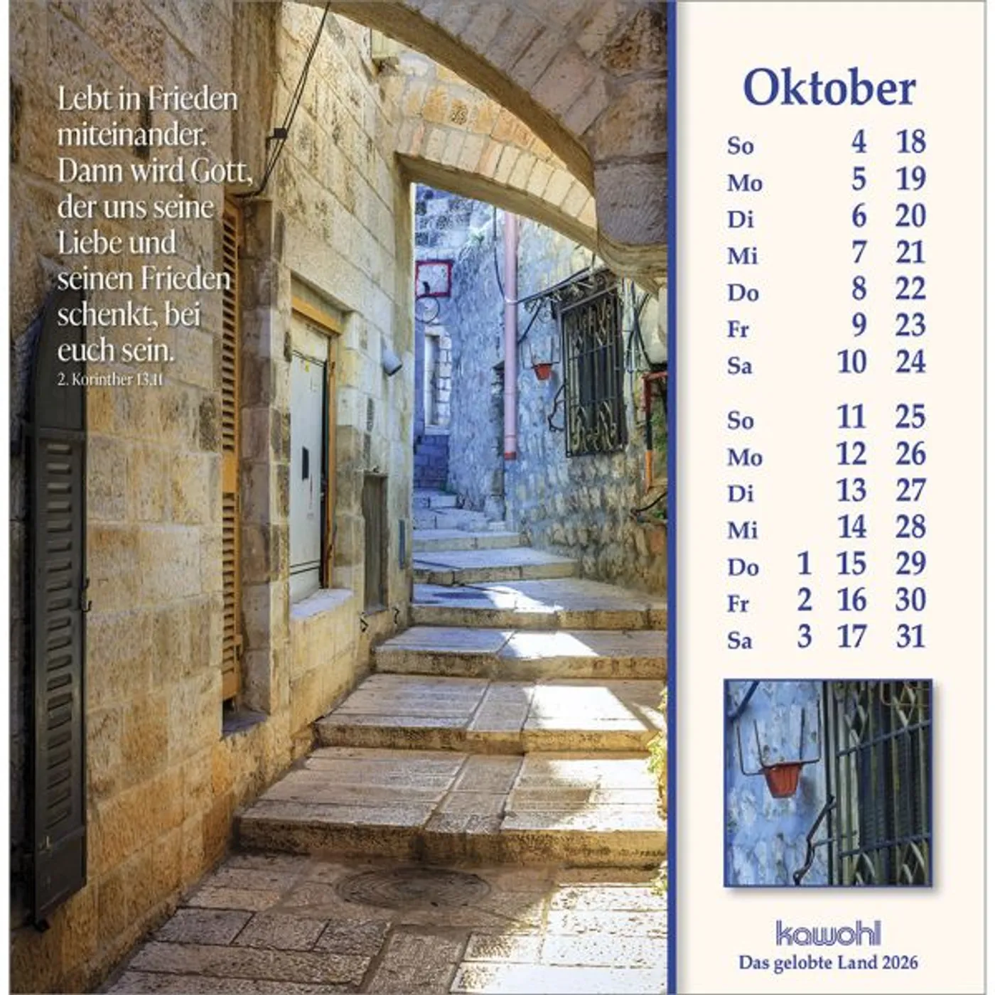 Mit herausragenden Bildern, hilfreichen Begleitinformationen (inkl. jüdischen Feiertagen) und passenden Bibelworten möchte der Israel-Kalender den Betrachter mitnehmen auf die Spuren Jesu Christi. Er möchte einen Einblick geben in das Land des Volkes Gottes, einen Eindruck von der lebendigen Gegenwart Israels.