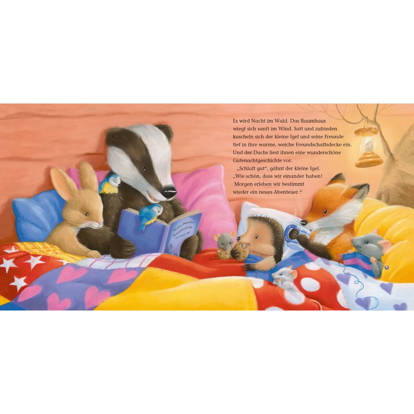 Im Herbst möchte der kleine Igel gerne eine Überraschungsfeier in seinem neuen Baumhaus machen, doch die große Kuscheldecke wird weggeweht. Oh weh, doch die Freunde haben eine tolle Idee.