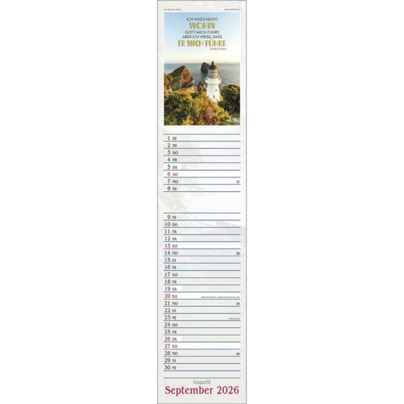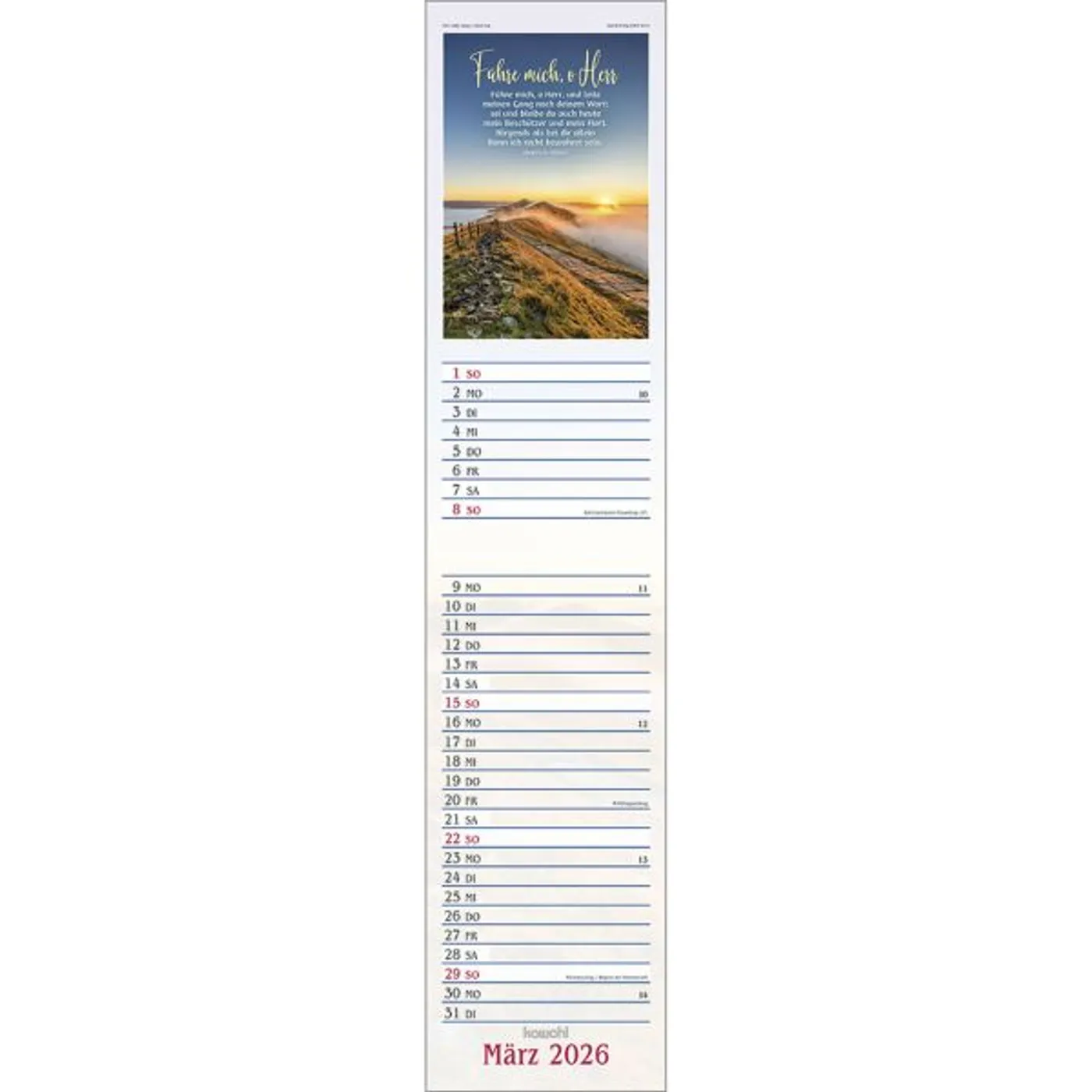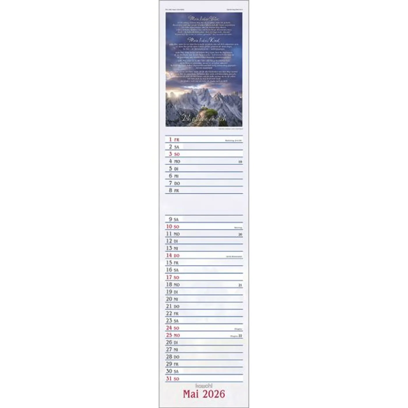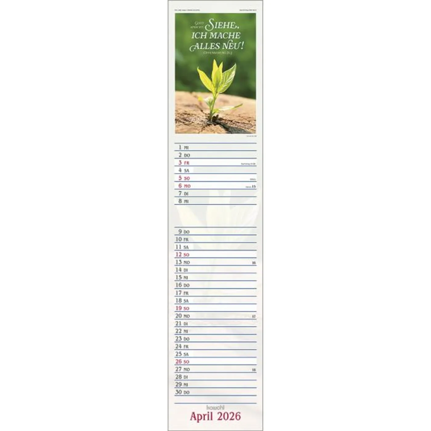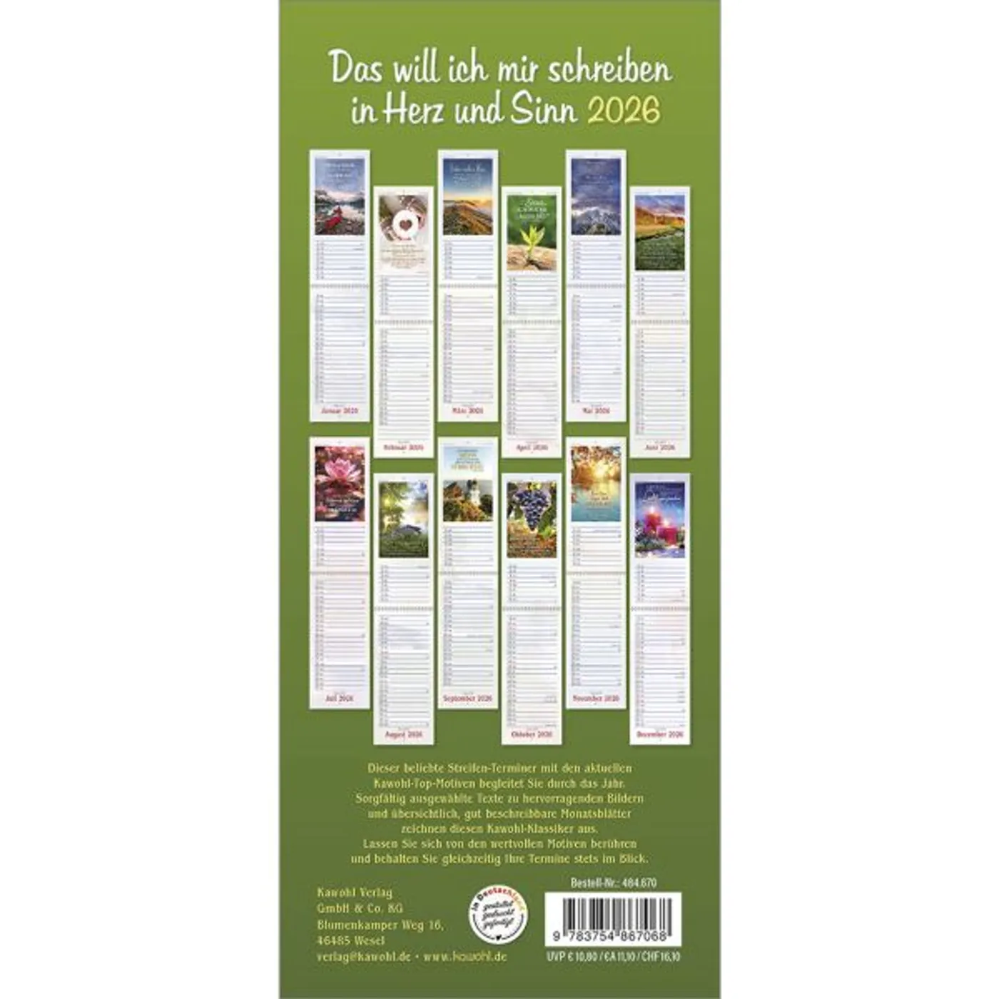 Dieser Terminer ist aufwändig gestaltet, mit leicht gesoftetem, gut beschreibbarem Untergrund, den beliebten Kawohl-Postermotiven und christlichen Texten.