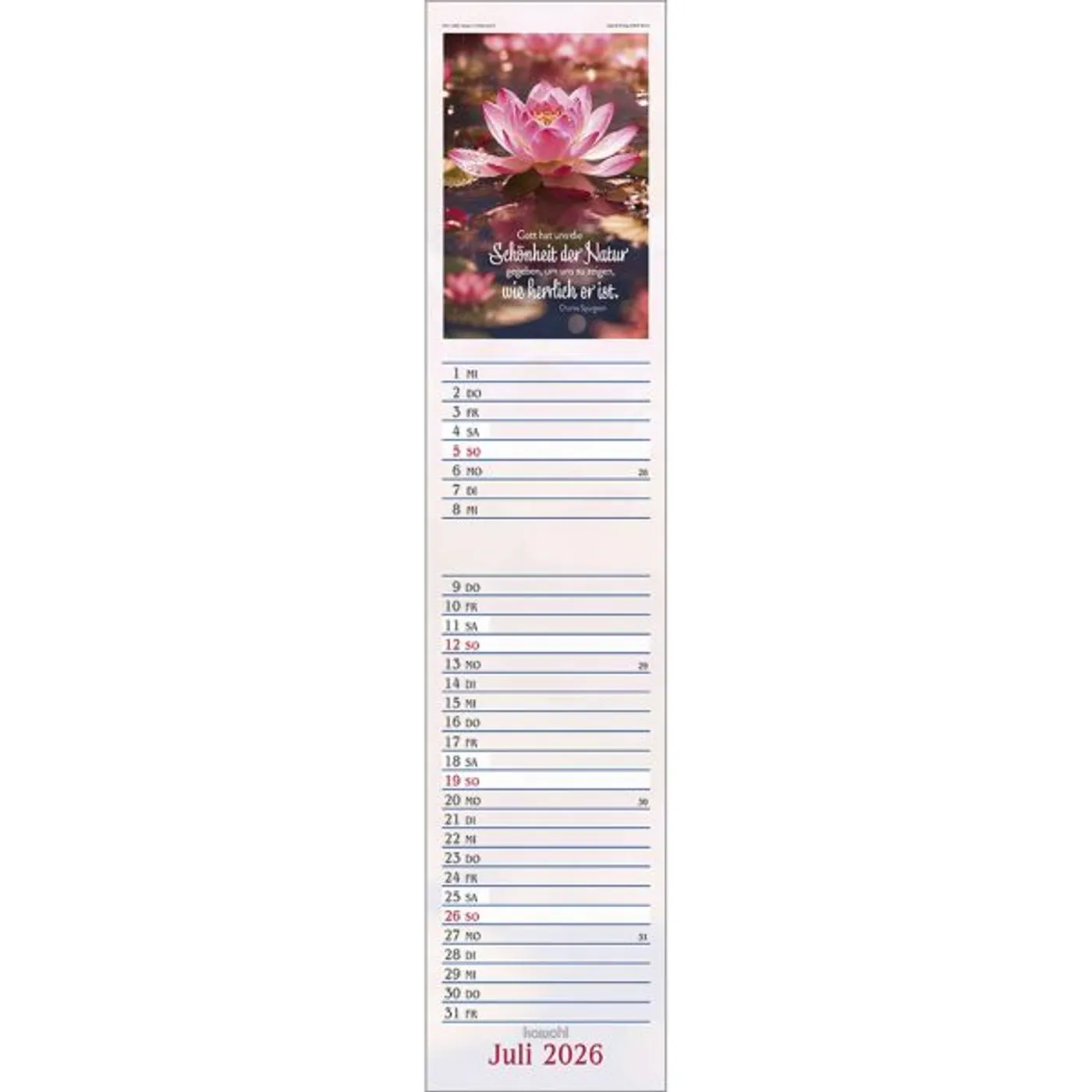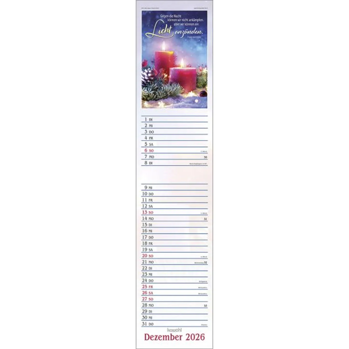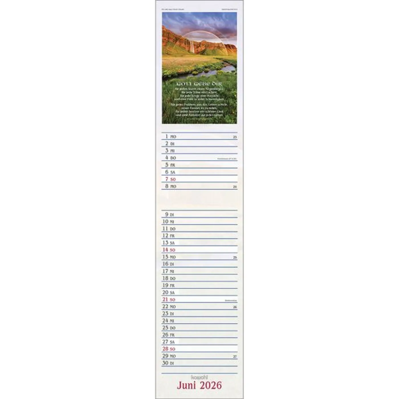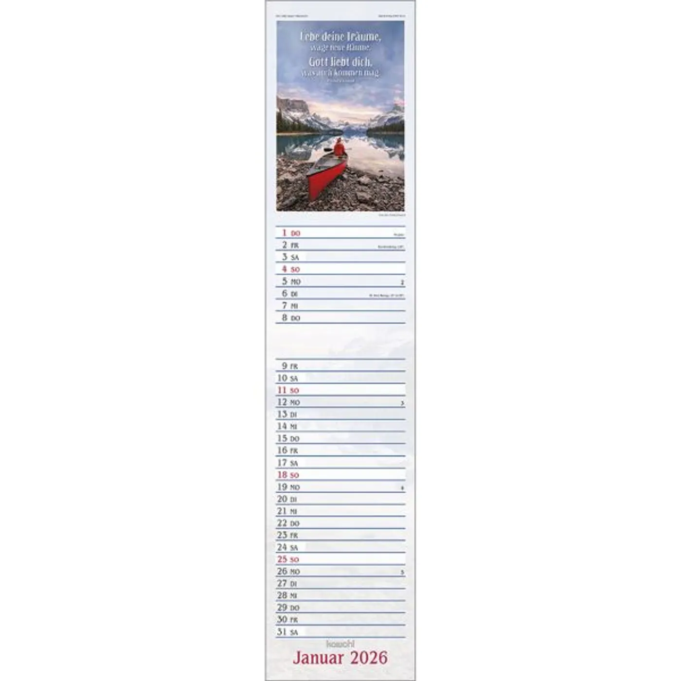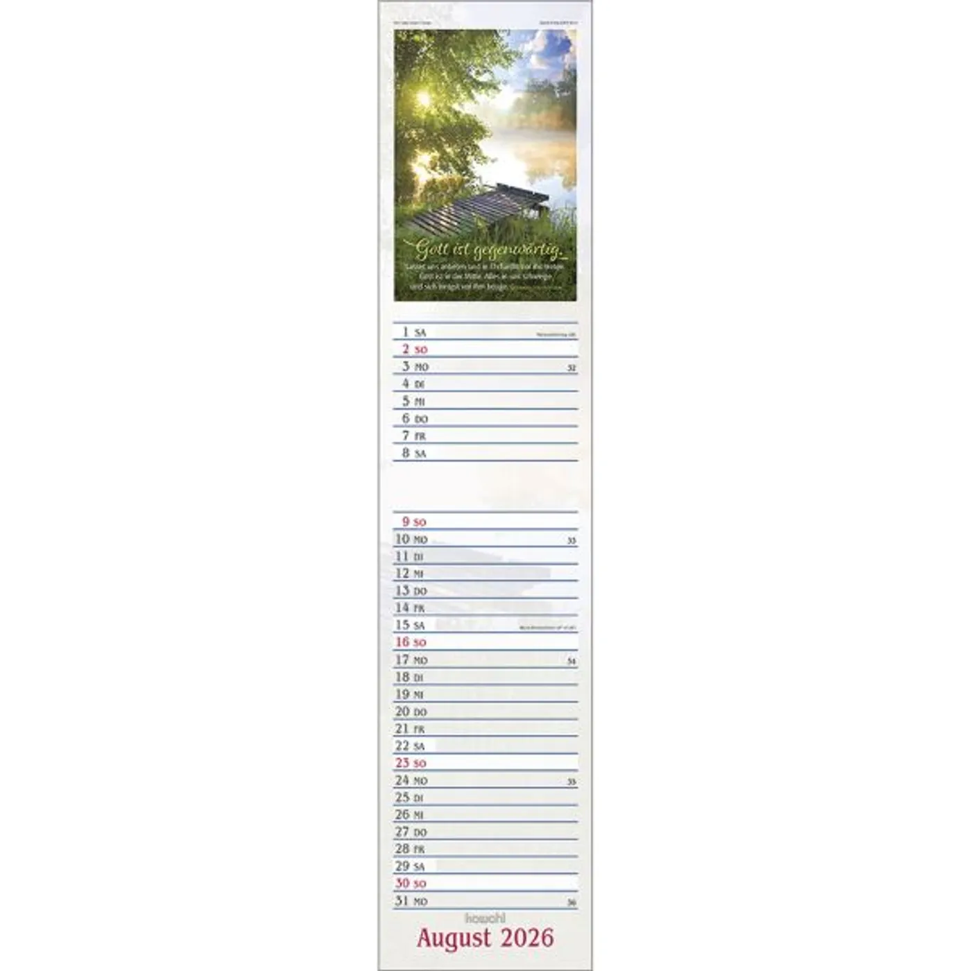 Dieser Terminer ist aufwändig gestaltet, mit leicht gesoftetem, gut beschreibbarem Untergrund, den beliebten Kawohl-Postermotiven und christlichen Texten.