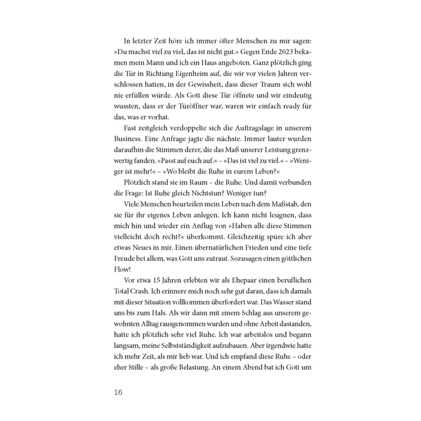 Zitat aus dem Buch: Du bist bereits im Land der Ruhe angekommen. Als Christ lebst du heute schon im Gelobten Land, in dem Milch und Honig fliessen und Gott selbst sich um deine Sicherheit kümmert, sodass du in Ruhe leben kannst. Du musst nichts TUN, um mehr Ruhe zu bekommen. Du darfst deine Gedanken auf Jesus fokussieren, auf das, was er bereits GETAN hat, und darauf, dass du bereits jetzt Ruhe hast. Das Land der Ruhe ist für dich gemacht - made by God. Ein vorbereiteter Ort, an dem du dich täglich daran erinnerst, dass er für dich kämpft, für dich sorgt, für dich da ist. S. 9.