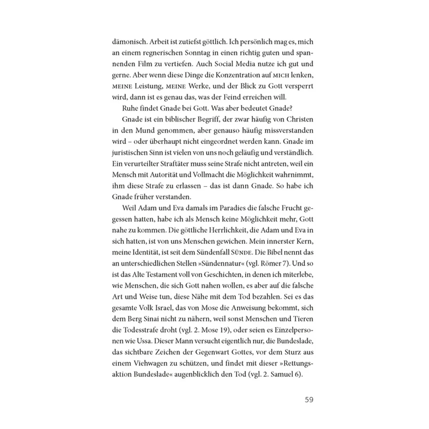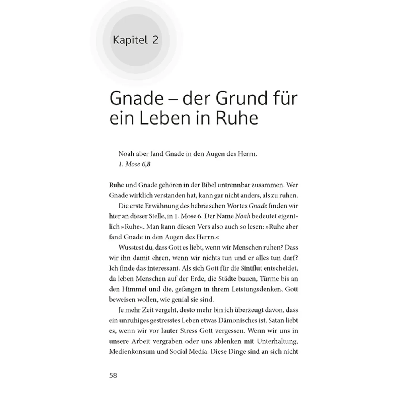 Nicht nur Bibelverse werden immer wieder zur Verdeutlichung hinzugezogen – auch wird mit theologischem Blick (und trotzdem verständlich) erklärt, wie sich Gottes Verheißung nach Ruhe bei IHM von Anbeginn der Zeit durch die gesamte Bibel zieht: Von Adam und Eva über Abraham, weiter zum Volk Israel über Jesus bis hin zu uns im Hier und Jetzt.