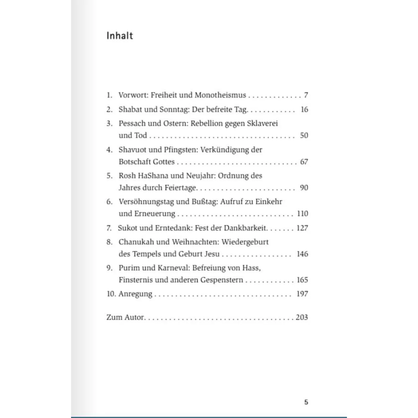 Das kluge und kulturgeschichtlich sehr spannende Buch Chaim Nolls untersucht zum einen die Shabat-Konzeption der Befreiung in ihrer Wirkung auf die Geschichte der Menschheit, z. Zum anderen werden im Zyklus des Jahres , beginnend mit Pesach/Ostern, die bis heute erkennbaren Zusammenhänge zwischen jüdischen und christlichen Festen paarweise an acht Beispielen betrachtet.