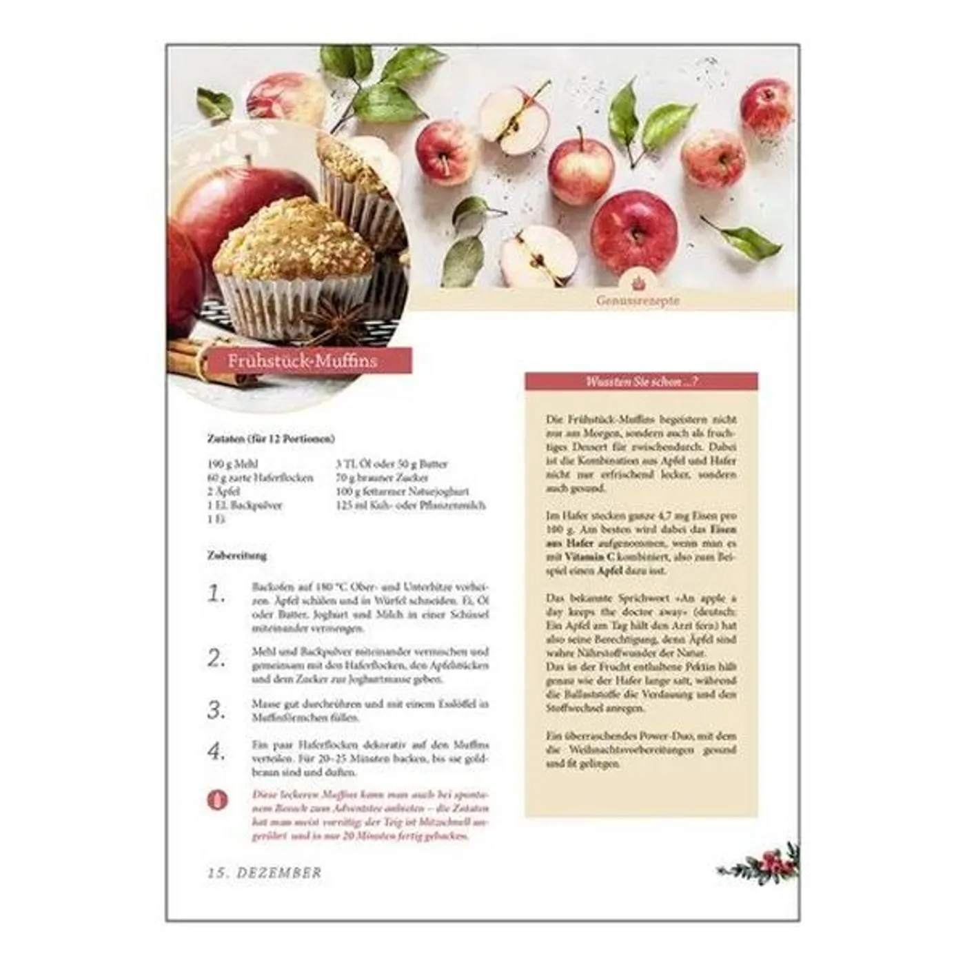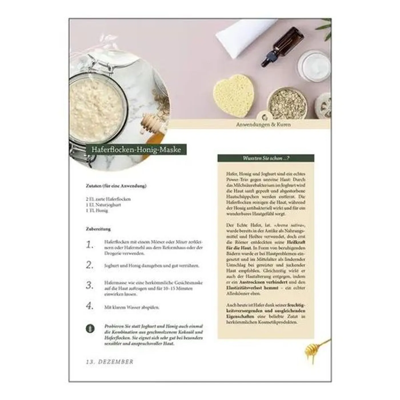 Lange Zeit unterschätzt, gilt Hafer heute als heimisches Superfood. Das Getreide ist ein echter Alleskönner für die Gesundheit: Neben wertvollen Vitaminen, Eisen und Magnesium kann Hafer dabei helfen, den Blutzucker- und Cholesterinspiegel zu senken und den Darm zu schützen. Bereits Hildegard von Bingen, Paracelsus oder Kneipp wussten die Heilkraft des goldenen Korns zu schätzen. Der abwechslungsreiche Adventskalender zeigt Ihnen die ganze Vielfalt des Hafers. Von gesunden und leckeren Rezepten wie Hafer-Apfel-Smoothie, Haferflocken-Zimt-Pancakes oder deftige Kartoffel-Hafer-Puffer bis zur traditionellen Haut- und Haarkur kommen Sie von Kopf bis Fuß gestärkt durch den Advent!