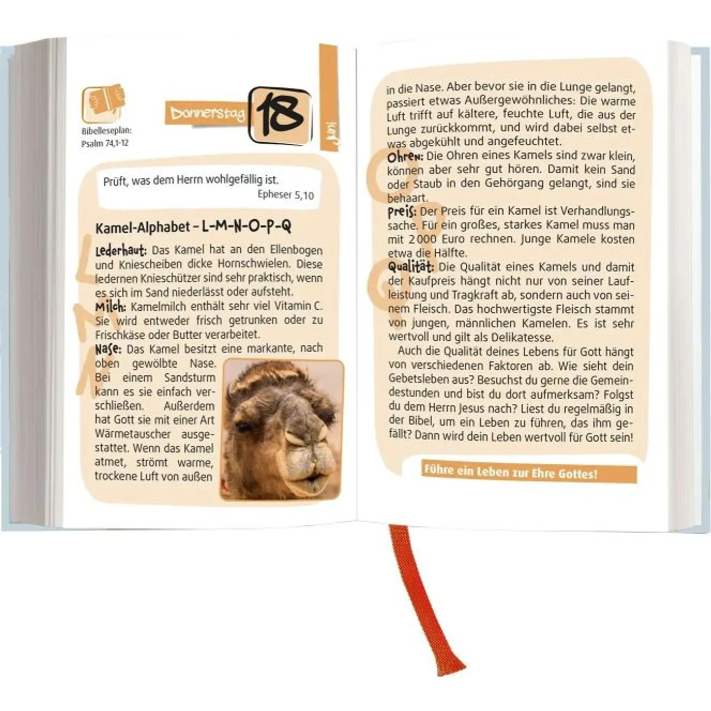 Dieser wegweisende, biblisch orientierte Kalender hat viel zu bieten: Täglicher Andachtsvers, Bibelleseplan, interessante Berichte, spannende Geschichten, am Sonntag eine kurze fortlaufende Andacht zu biblischen Büchern ... und nicht zu vergessen: die Samstagsüberraschung. Zum Vorlesen in der Familie und zum Selberlesen. Evangelistisch gut einsetzbar!