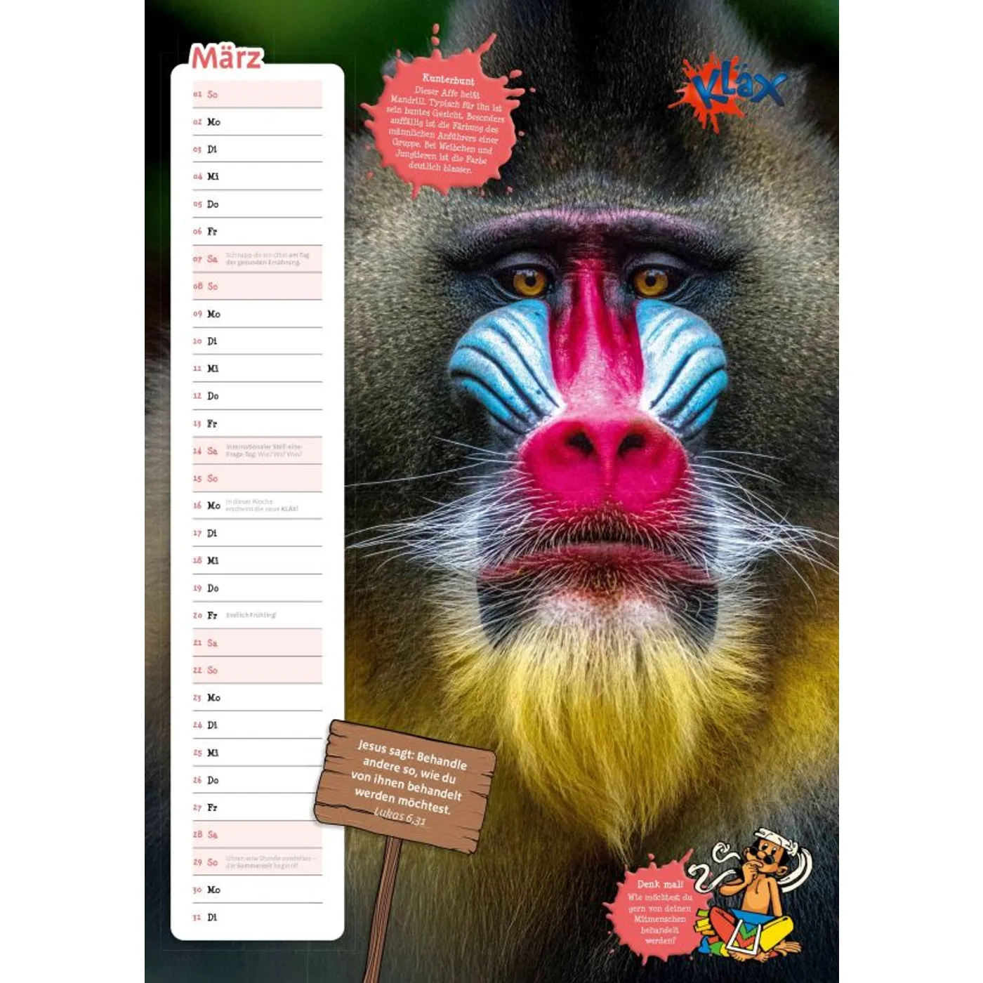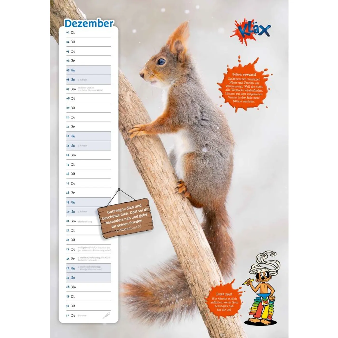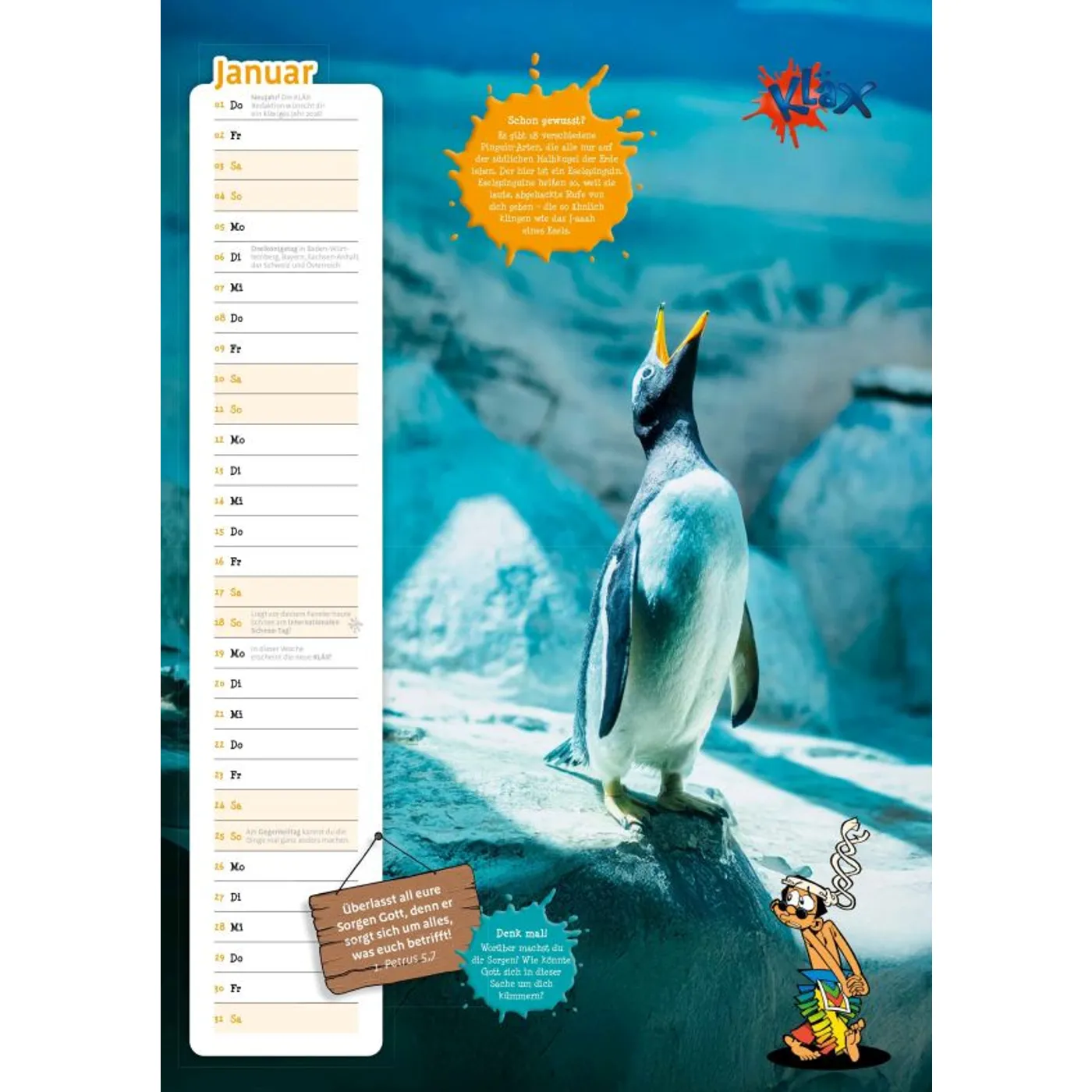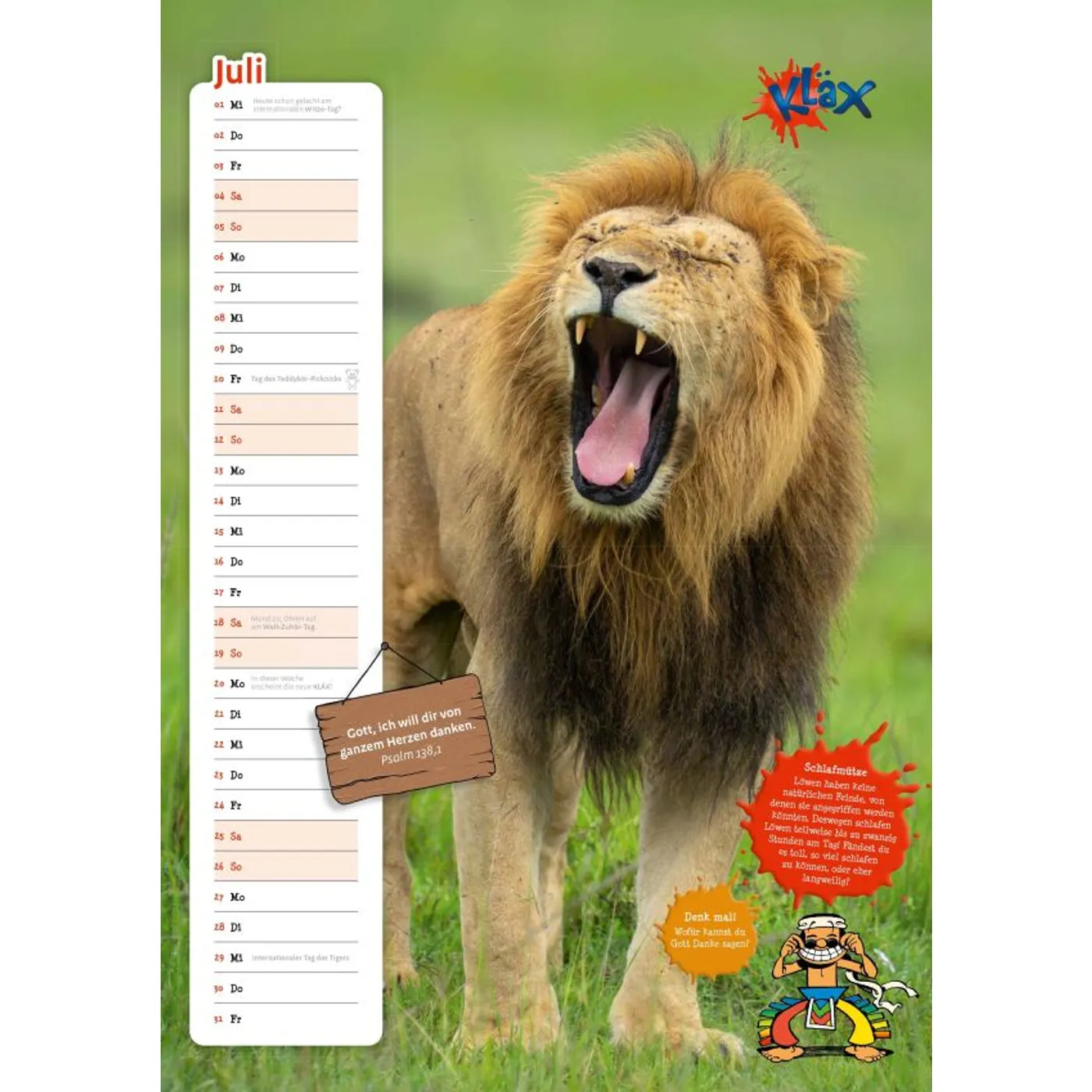 Im beliebten KLÄX-Kalender gibt es jeden Monat tolle Tierfotos, witzige Sprüche und Tipps zum Nach- und Weiterdenken über die Bibel, Gott und die Welt. Mister Kläx, die lustige Titelfigur der Kinderzeitschrift KLÄX, begleitet Kids ab 8 Jahren durch das Jahr.