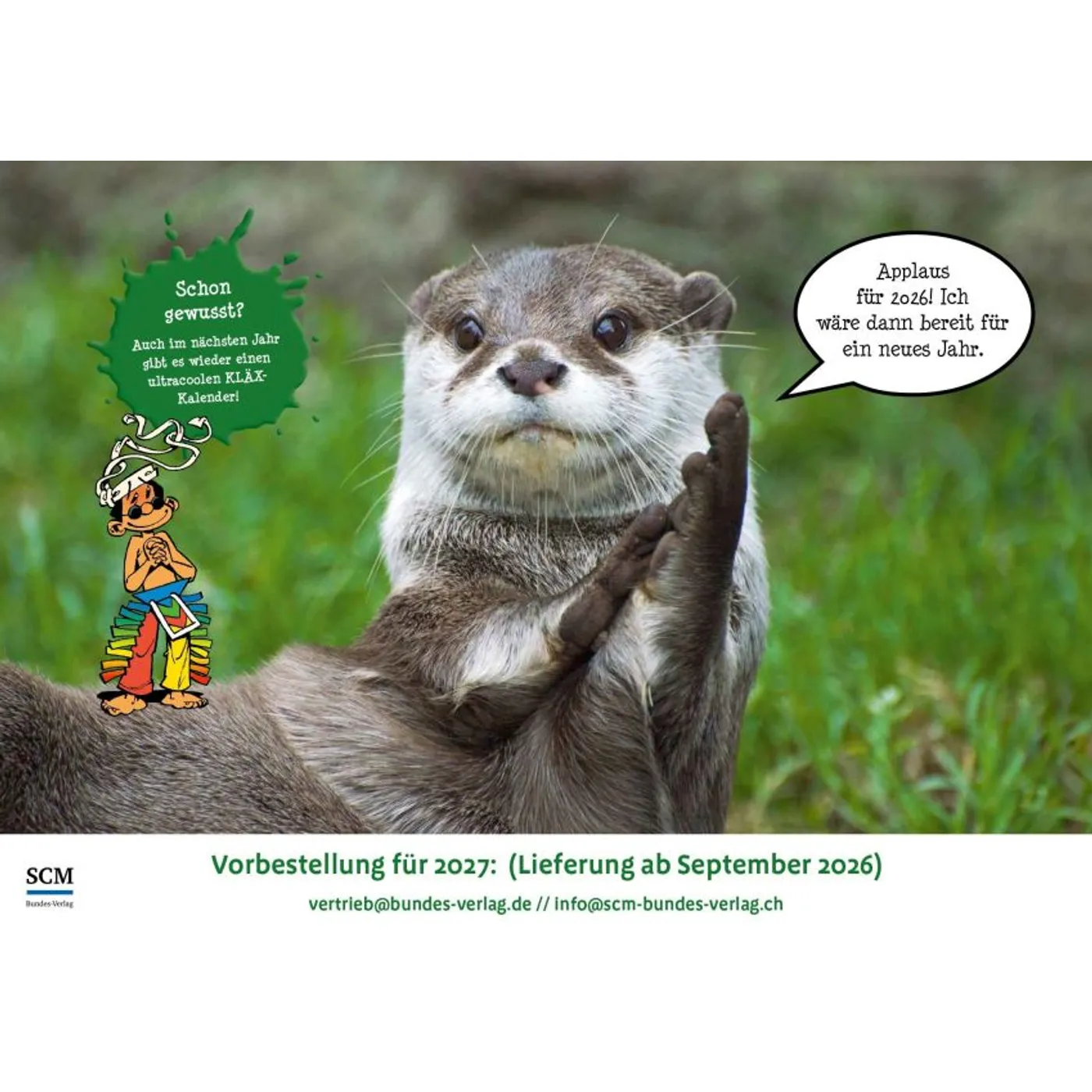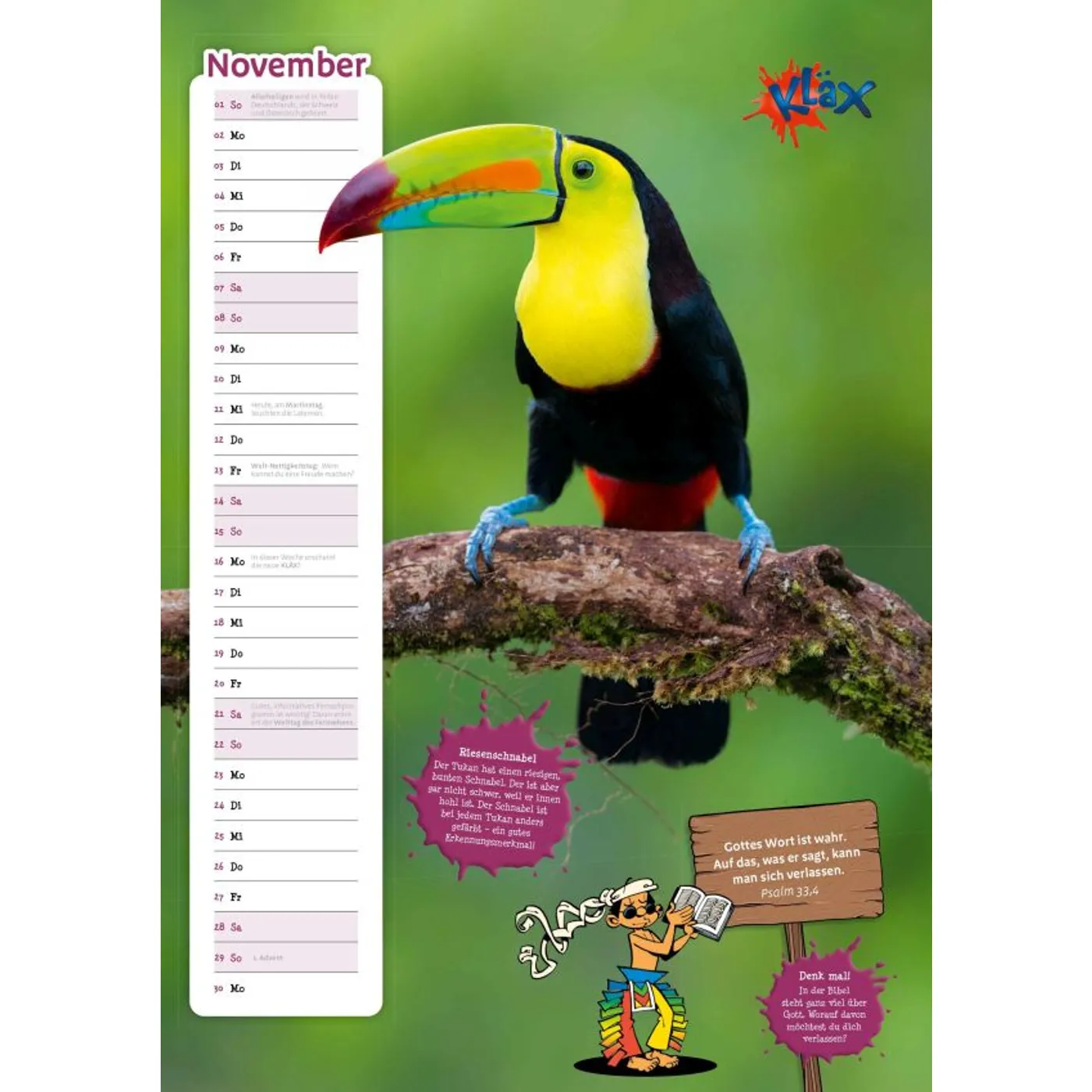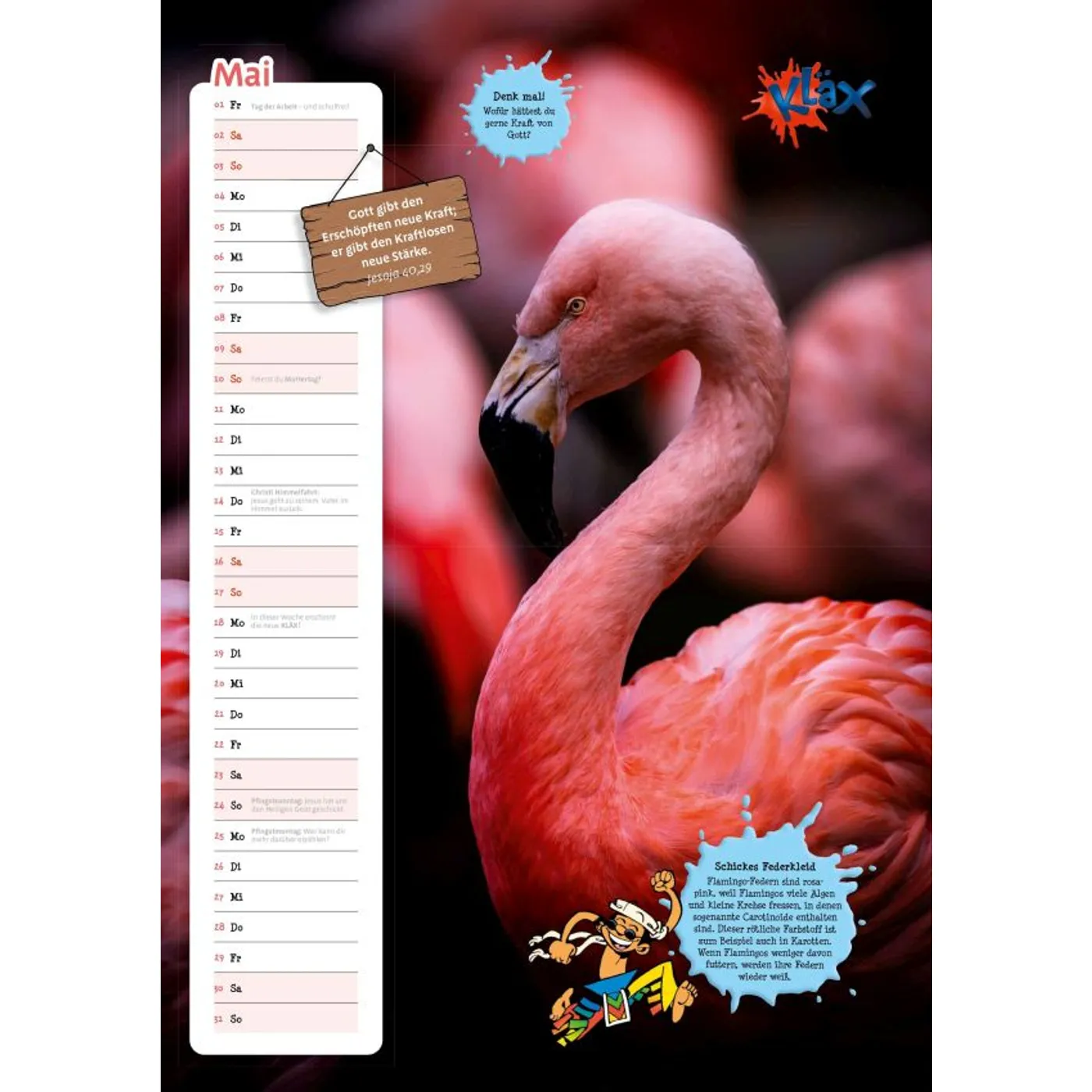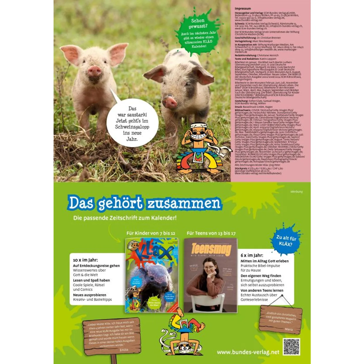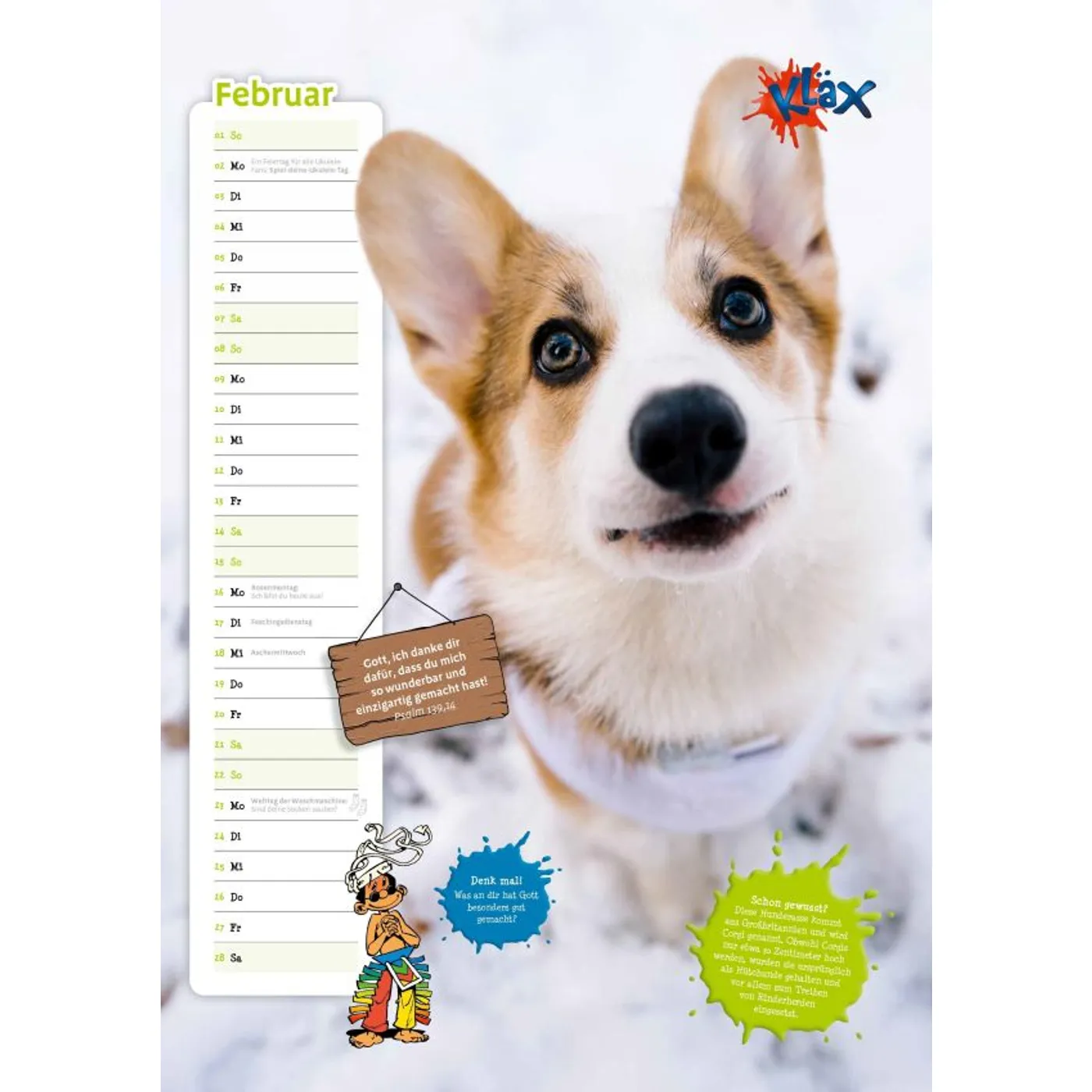 Im beliebten KLÄX-Kalender gibt es jeden Monat tolle Tierfotos, witzige Sprüche und Tipps zum Nach- und Weiterdenken über die Bibel, Gott und die Welt. Mister Kläx, die lustige Titelfigur der Kinderzeitschrift KLÄX, begleitet Kids ab 8 Jahren durch das Jahr.