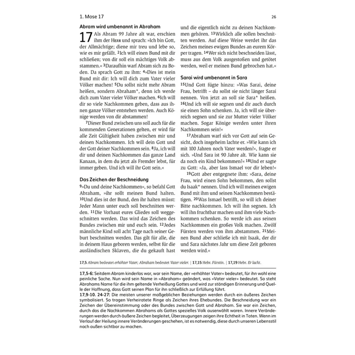 Um mit der Ausstattung zu beginnen: im Vergleich zu vielen anderen Bibelausgaben, die ich in der Hand hatte, ist diese äußerst lese- und benutzerfreundlich gestaltet. Es gibt viele Anmerkungen, sowohl zur Übersetzung als auch zum Inhalt; diese finden sich auf den jeweiligen Seiten. Besonders erwähnen und hervorheben will ich an dieser Stelle auch die ausreichend große Schrift. So manche Bibelausgabe läßt sich trotz Lesebrille nur mit einer Lupe lesen - hier braucht man weder Lesebrille noch Lupe. Der Text ist augenfreundlich gegliedert und die Schrift ausreichend groß, so daß sich auch längere Passagen ermüdungsfrei lesen lassen. Prima - so sollte ein Buch, das man oft in die Hand nehmen will (oder soll) gestaltet sein!