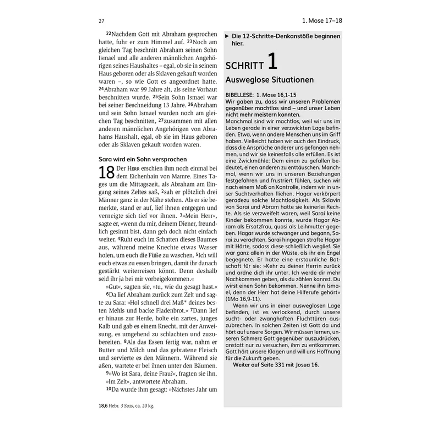 Diese Bibelausgabe ist angereichert mit vielen Erläuterungen und geistlichen Betrachtungen. Sie knüpfen jeweils an einen Bibelabschnitt an und beziehen die »Zwölf Schritte« ein - das Selbsthilfeprogramm, das von den Anonymen Alkoholikern entwickelt wurde und seitdem auch für viele andere Abhängigkeiten angewandt wird.
