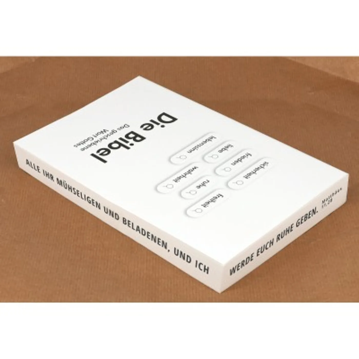 Handliche Bibel in unserem Standardbibel-Format im biegsamen Paperback-Umschlag. Der Schnitt der Bibel ist bedruckt mit "Jesus spricht: Kommt her zu mir, alle ihr Mühseligen und Beladenen, und ich werde euch Ruhe geben" Matth. 11,28