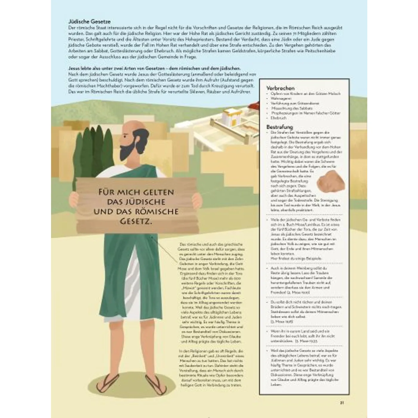Farbenfroh und bunt werden große und kleine Leser in die Welt zu Zeiten Jesu mitgenommen. In 24 Abschnitten erfährt man so einiges über die Gesellschaft, Häuser, Kleidung, Arbeit, Landwirtschaft, das Leben der Frauen aber auch über den römischen Einfluss, Gesetze und vieles mehr. Manchmal werden hier auch römische und Jüdische Gesetzte oder Gesellschaftliches gegenüber gestellt.