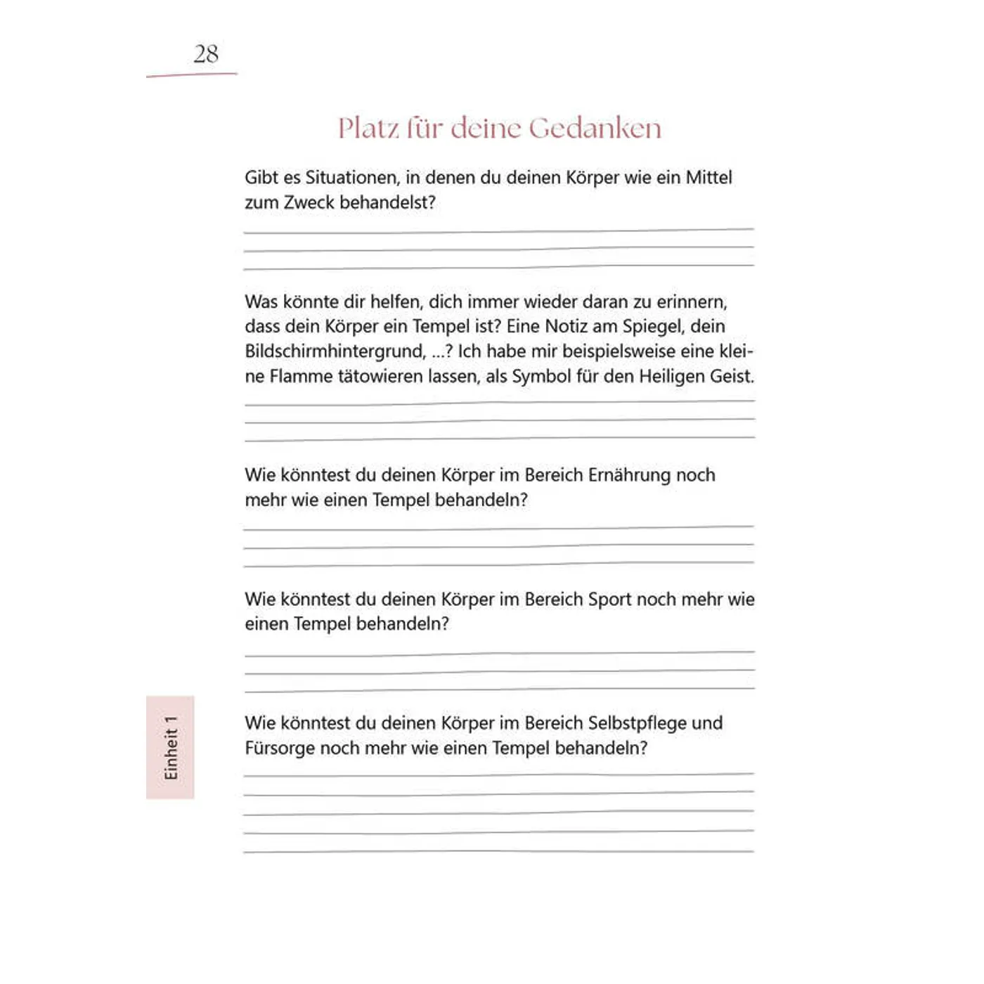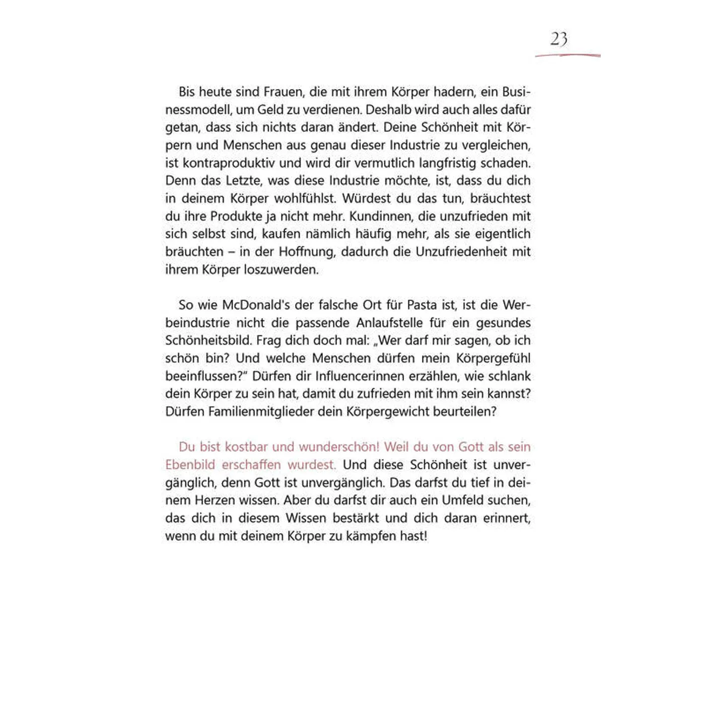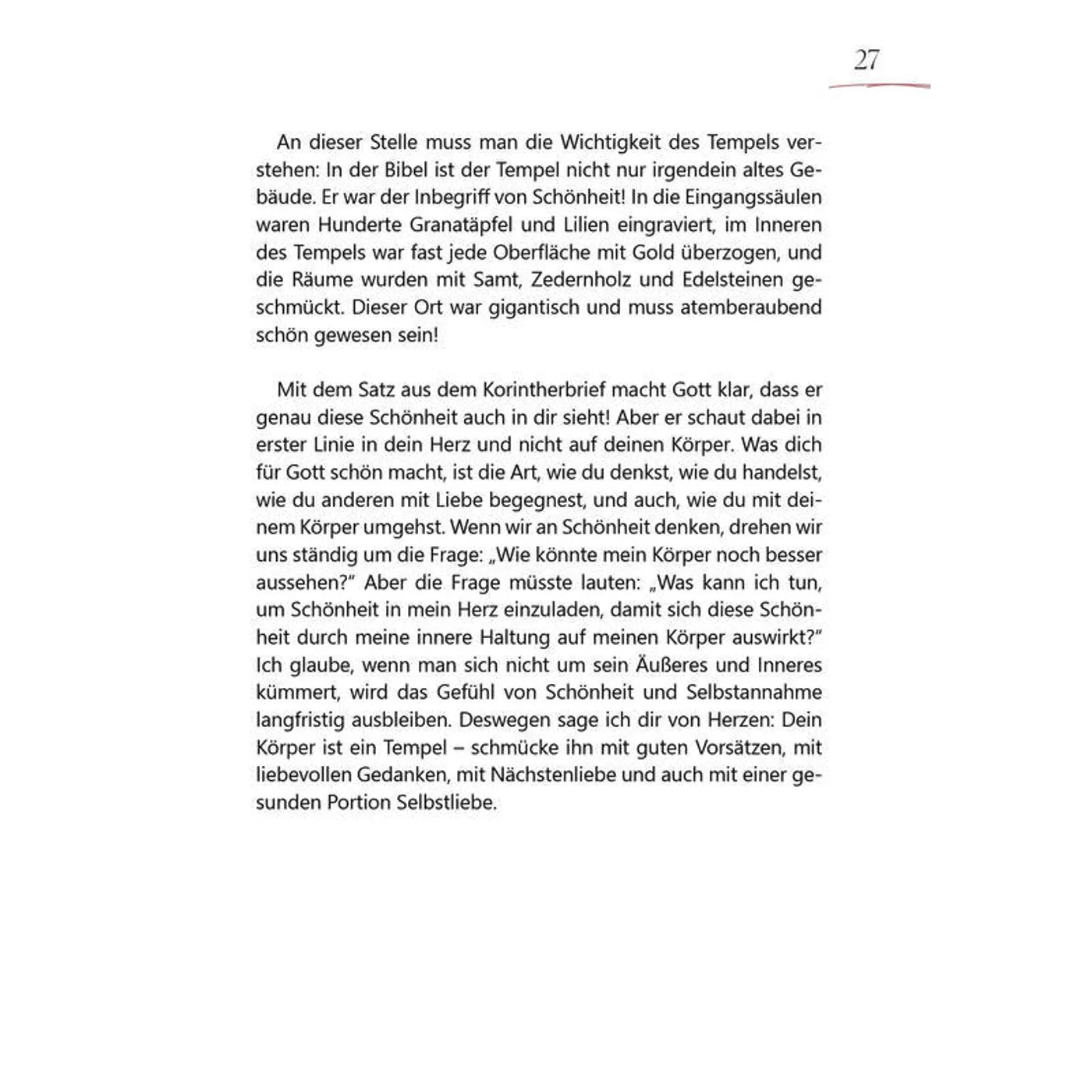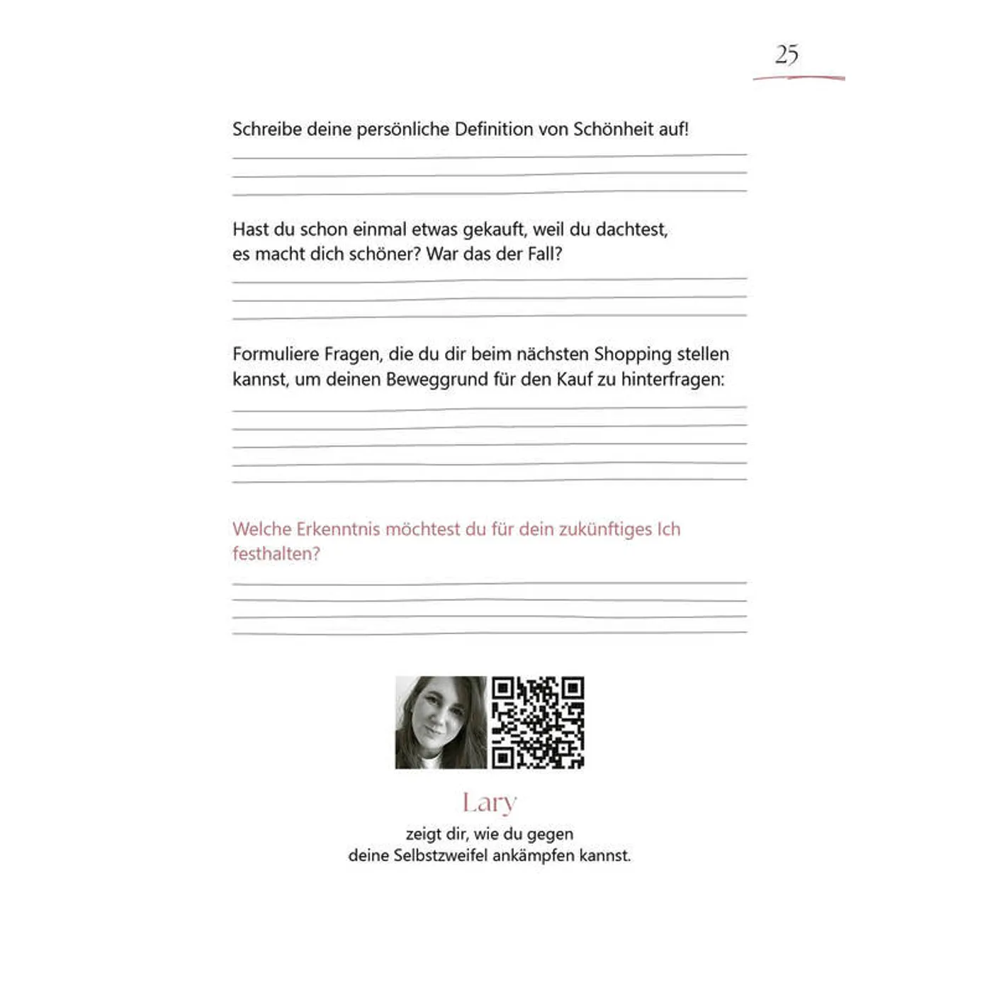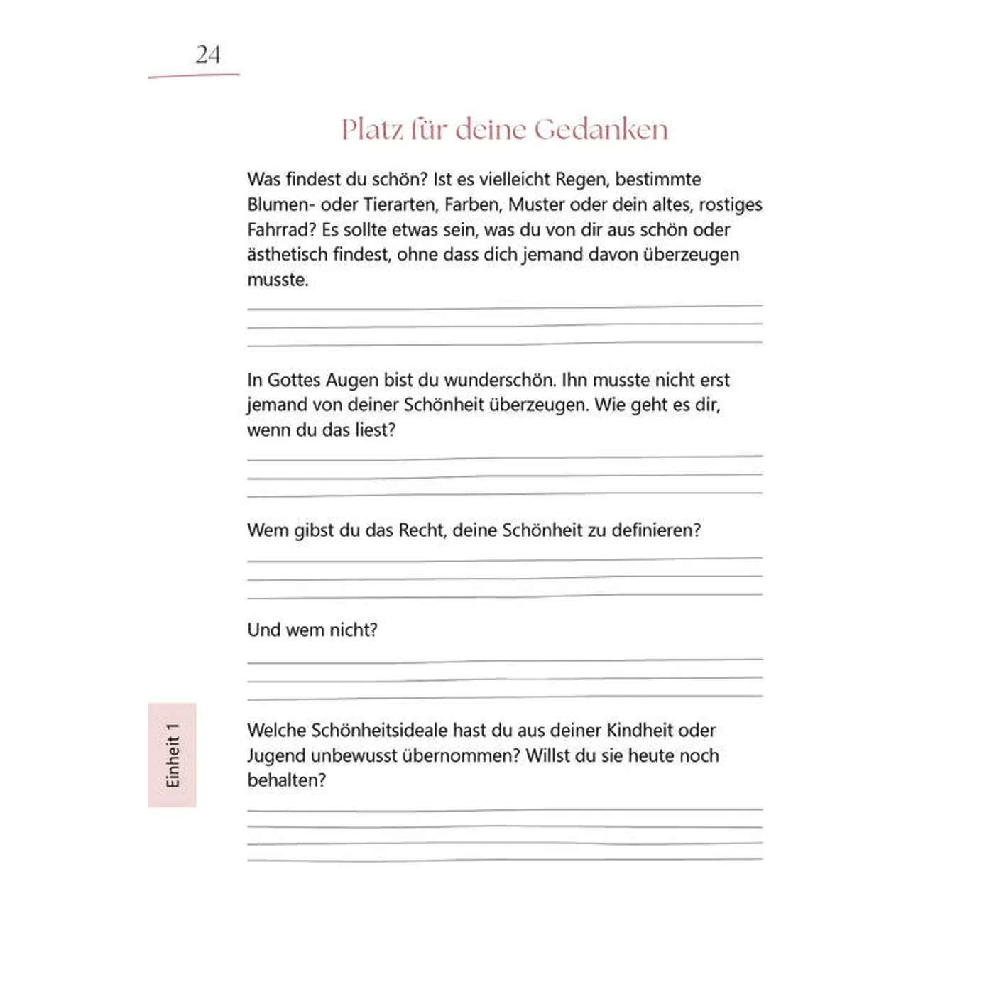 Dieses Büchlein begleitet genau auf diesem Weg. In 36 liebevoll gestalteten Einheiten setzt man sich mit unterschiedlichen Aspekten von Schönheit auseinander: mit dem eigenen Körper, dem Umfeld und dem inneren Ich. Nach jedem Impuls folgt eine Reflexion sowie eine leere Seite für persönliche Gedanken. Hier dürfen Gefühle ihren Platz finden, Zweifel ausgesprochen und Erkenntnisse festgehalten werden, die im Laufe der Zeit wachsen.