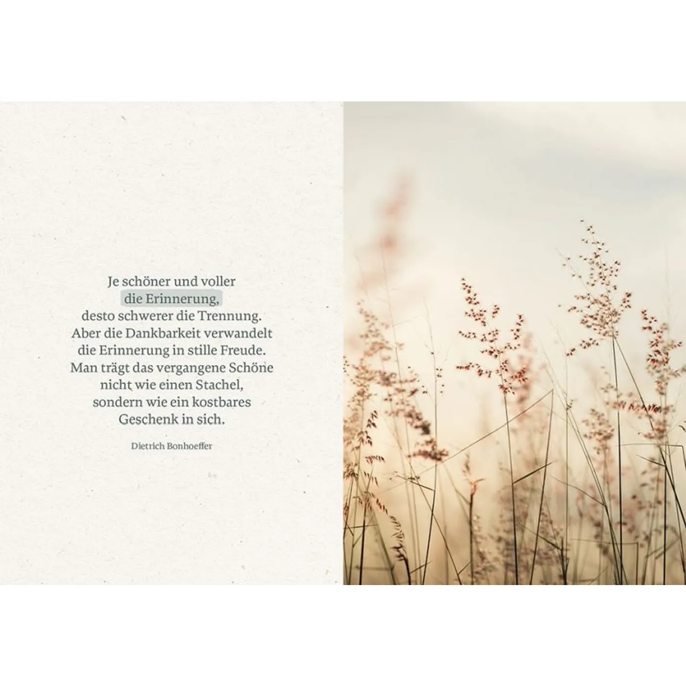 Dieses Geschenkheftchen möchte in Zeiten des Abschiednehmens und der Trauer Trost spenden und aufrichten. Einfühlsame und ermutigende Worte für Menschen, die Abschied nehmen müssen. Die Texte sprechen von einer Hoffnung, die das Herz zur Ruhe kommen lässt und Zuversicht schenkt, im Alltag wieder Vertrauen zu fassen.