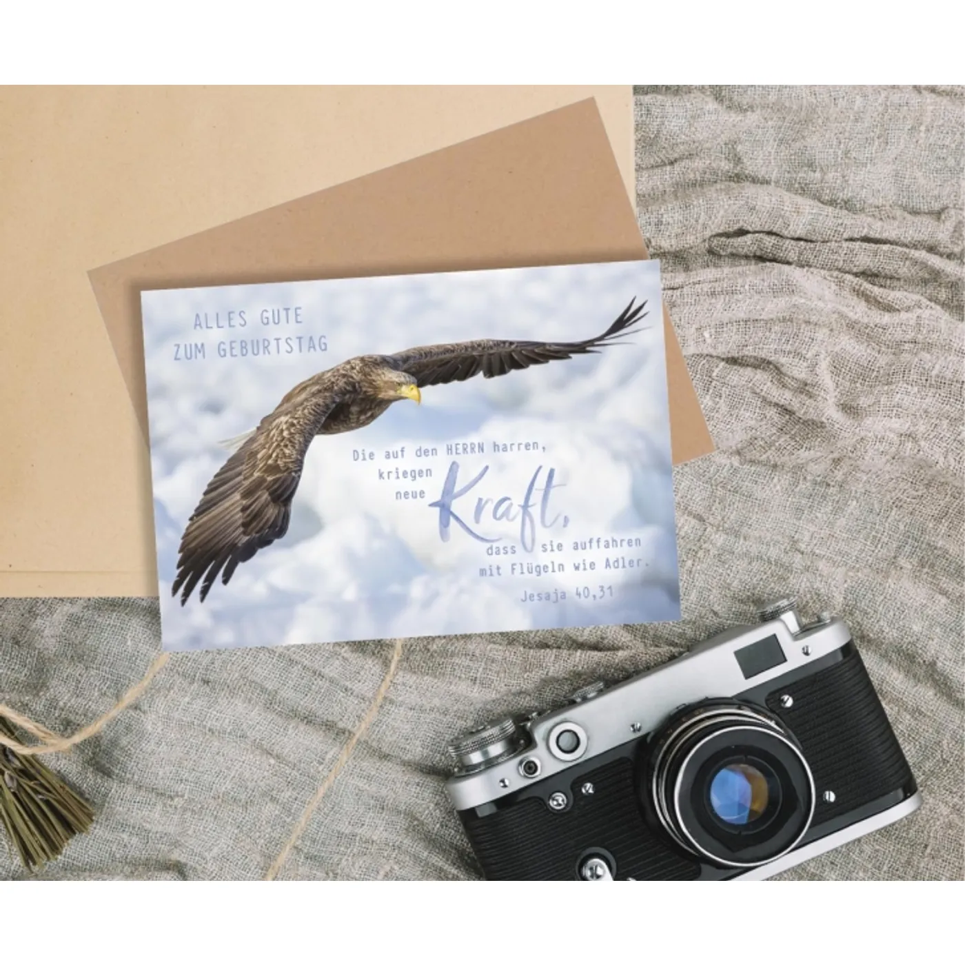 Der auf der Karte enthaltene Bibelvers aus Jesaja 40,31 lautet: „Die auf den Herrn harren, kriegen neue Kraft, dass sie auffahren mit Flügeln wie Adler.“