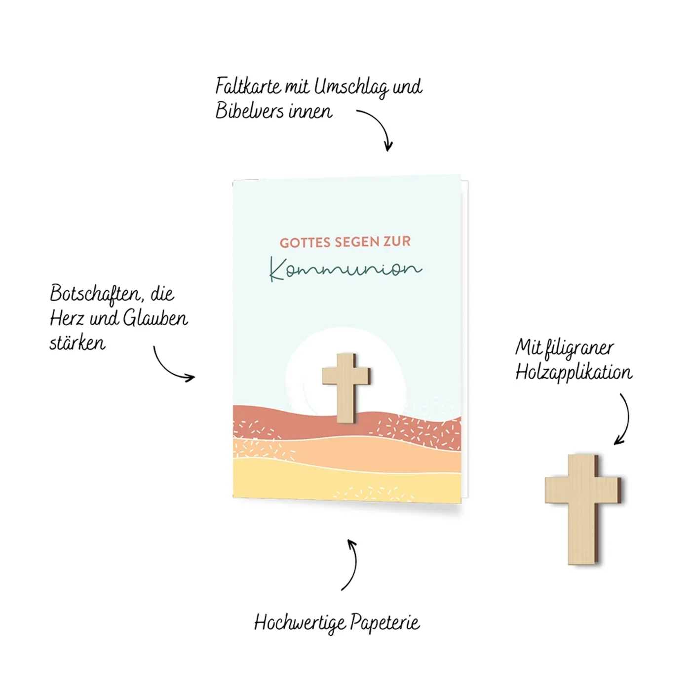 Segen, der von Herzen kommt: Diese liebevoll gestalteten Faltkarten verbinden hochwertige Papeterie mit einer besonderen Symbolkraft: Eine filigrane Holzapplikation und christliche Worte der Ermutigung machen jede Karte zu einem besonderen Geschenk mit bleibendem Wert - Botschaften, die Herz und Glauben stärken.