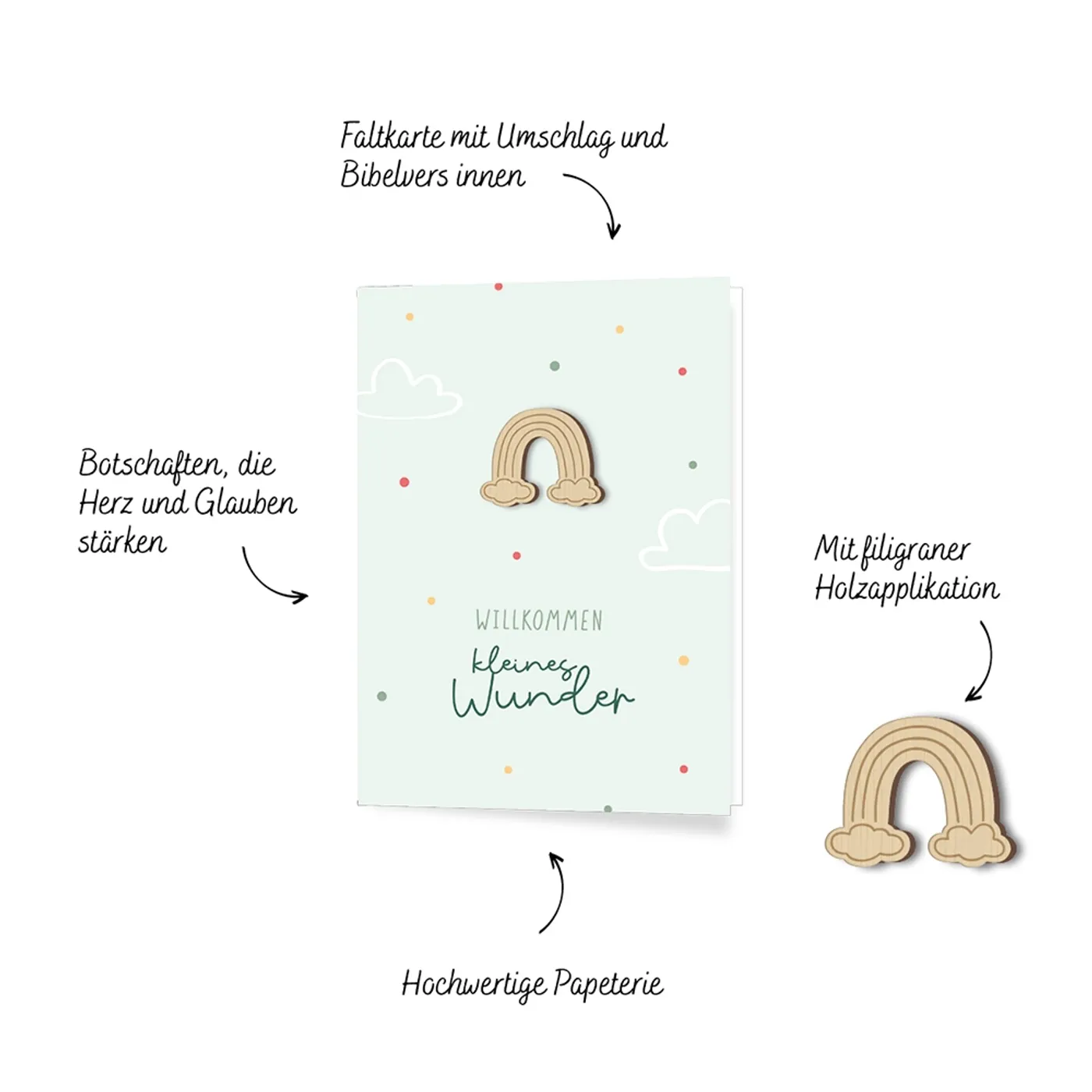 Segen, der von Herzen kommt: Diese liebevoll gestalteten Faltkarten verbinden hochwertige Papeterie mit einer besonderen Symbolkraft: Eine filigrane Holzapplikation und christliche Worte der Ermutigung machen jede Karte zu einem besonderen Geschenk mit bleibendem Wert - Botschaften, die Herz und Glauben stärken.