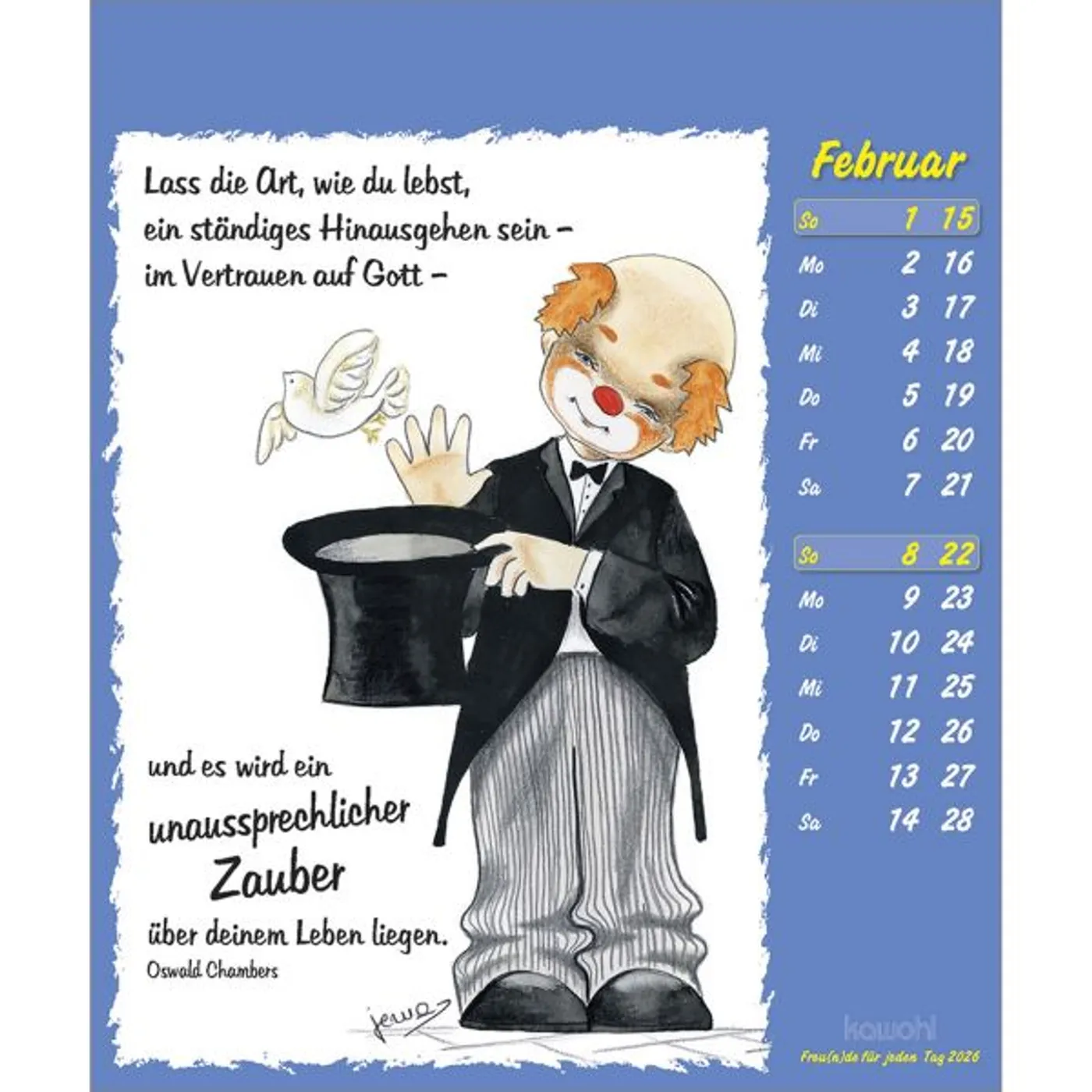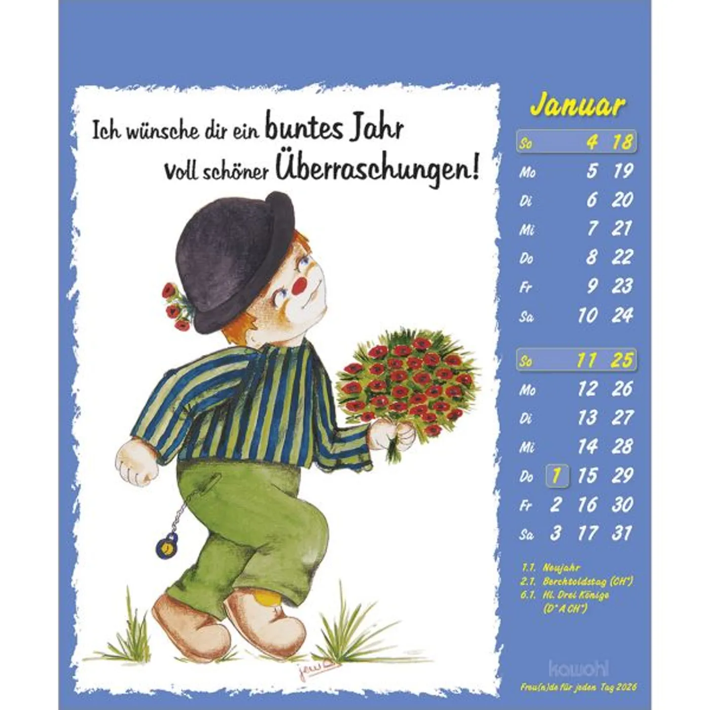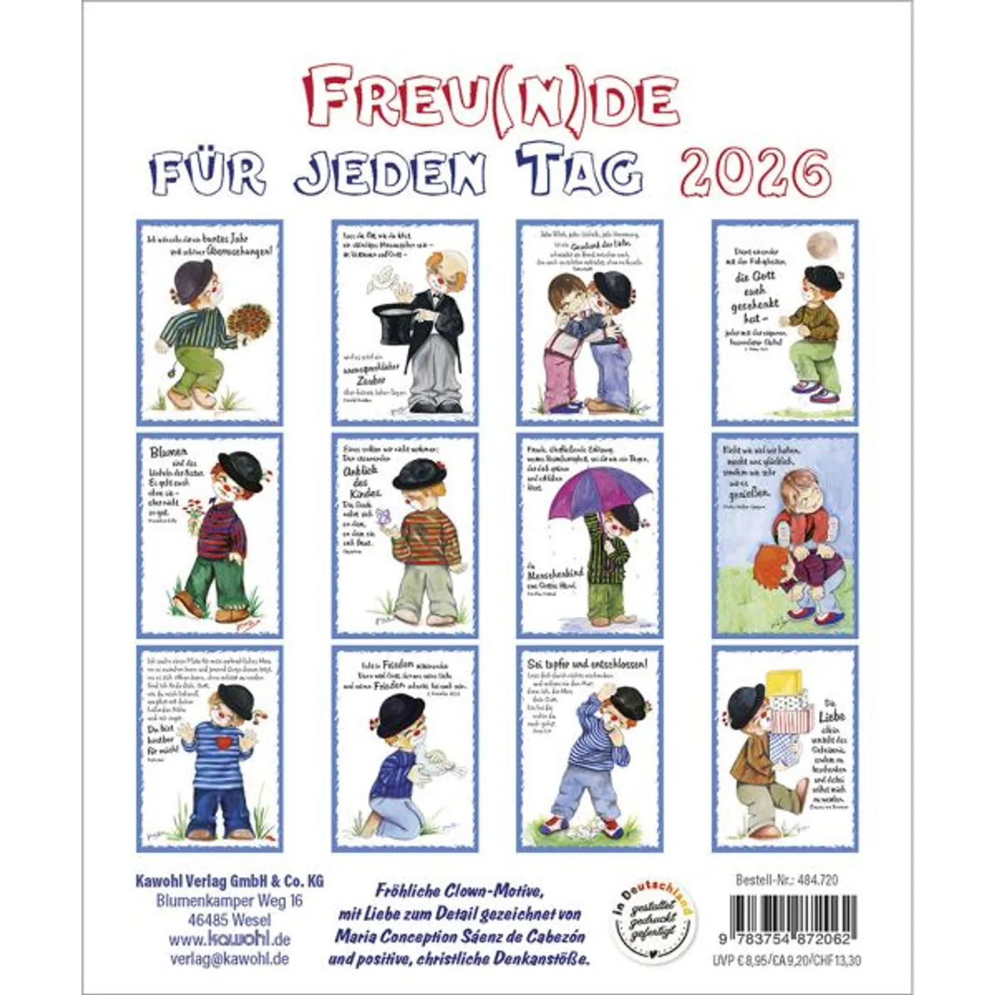 Lustige Bilder aus der Welt der Fantasie, die zum Schmunzeln anregen. Fröhliche Clown-Motive, mit Liebe zum Detail gezeichnet von Maria Conception Sáenz de Cabezón, und positive christliche Denkanstöße.