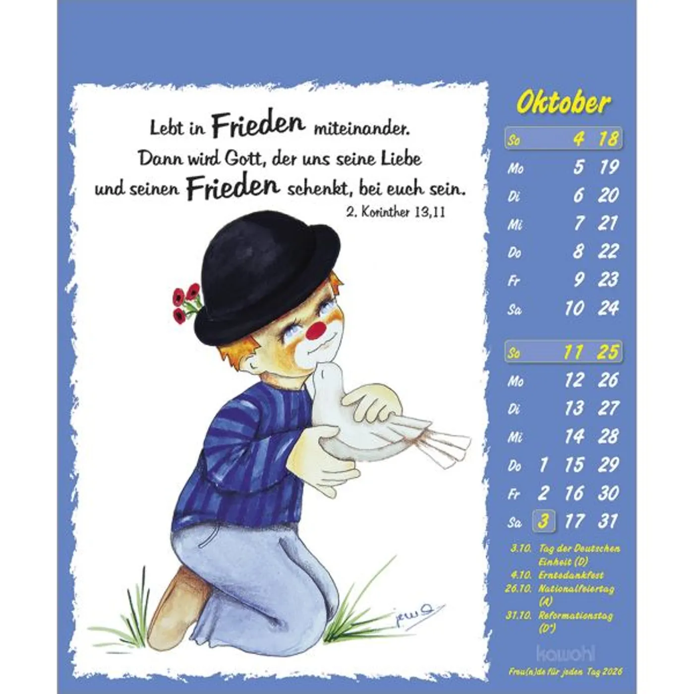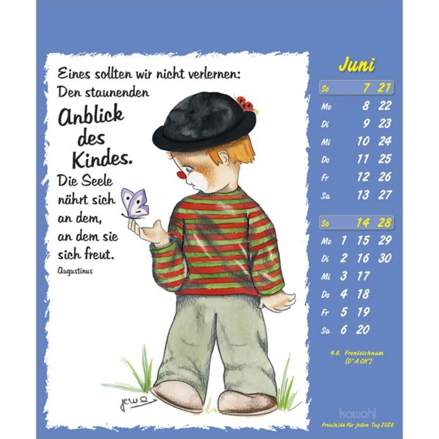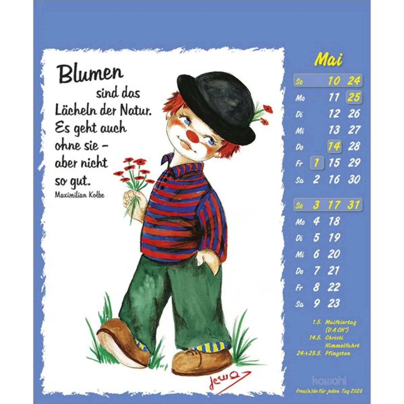 Lustige Bilder aus der Welt der Fantasie, die zum Schmunzeln anregen. Fröhliche Clown-Motive, mit Liebe zum Detail gezeichnet von Maria Conception Sáenz de Cabezón, und positive christliche Denkanstöße.
