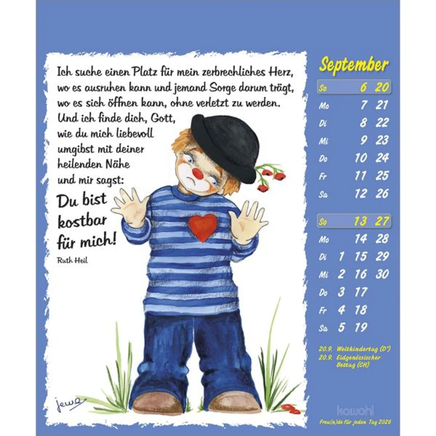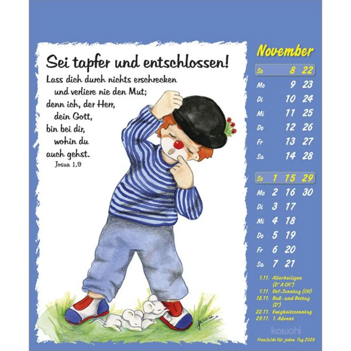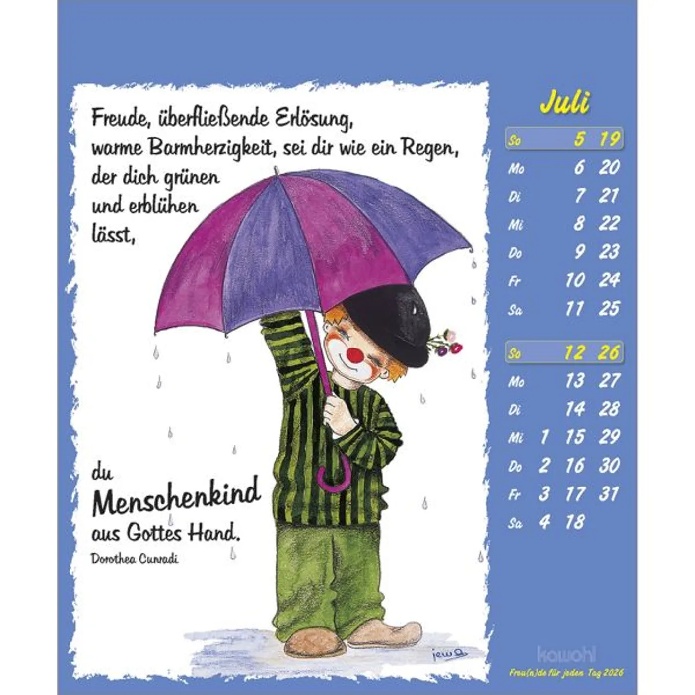 Fröhliche Clown-Motive gezeichnet von Maria Conception Sáenz de Cabezón mit Mut machenden christlichen Texten