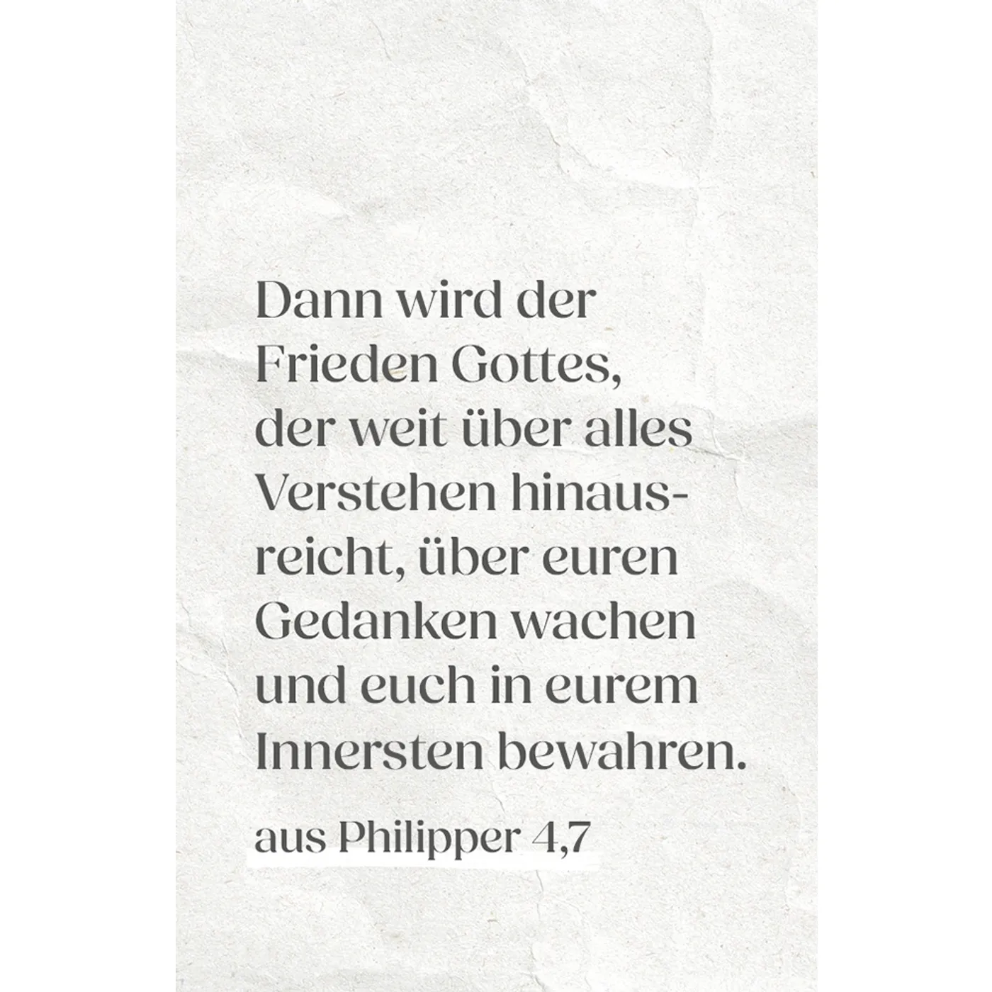 Dieses Set mit 25 Verteilkärtchen voller ermutigender Worte und Bibelverse trägt den Frieden Gottes in den Alltag. Die Karten laden dazu ein, Frieden weiterzugeben, Hoffnung zu schenken und sich an die Gegenwart Gottes zu erinnern. Zum Weitergeben an Feiern, Veranstaltungen, Gottesdiensten, zum Jahreswechsel oder einfach so zwischendurch - kleine Botschaften, die Herzen berühren.
