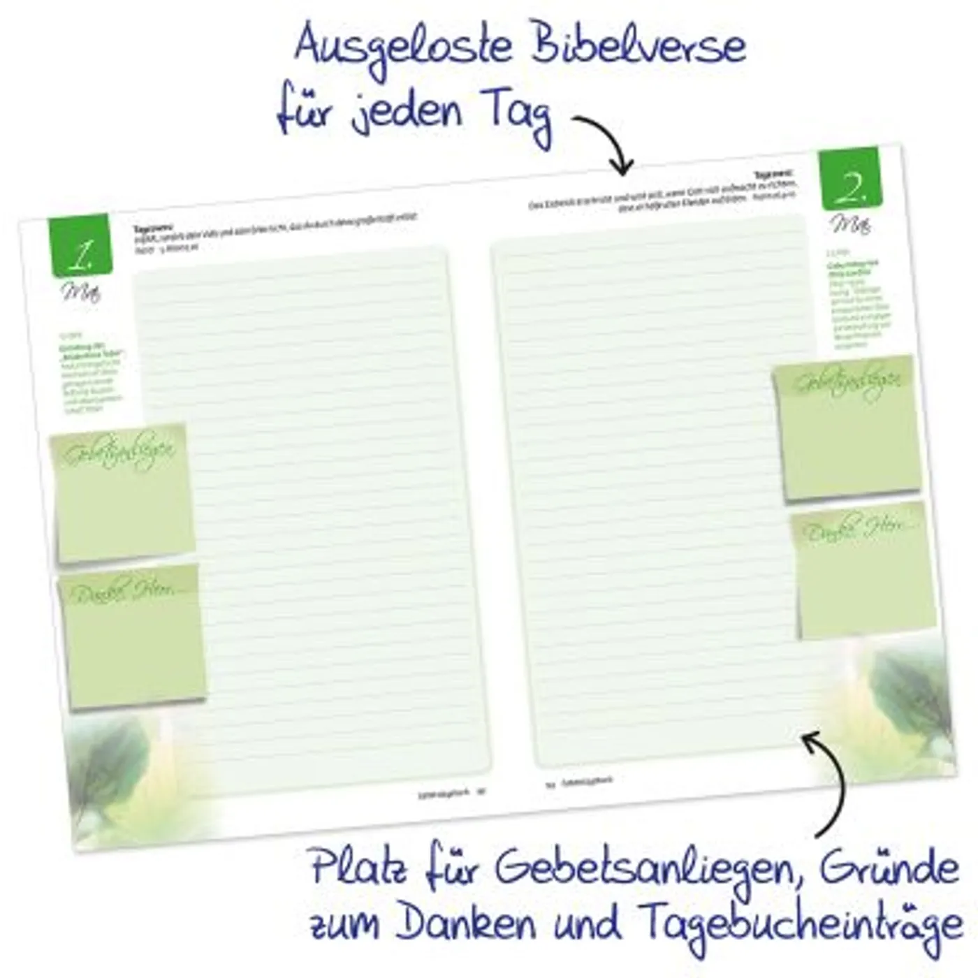 - für jeden Tag eine Seite mit einem Bibelvers mit Platz für Gebetsanliegen, Gründe zum Danken und für Tagebucheinträge