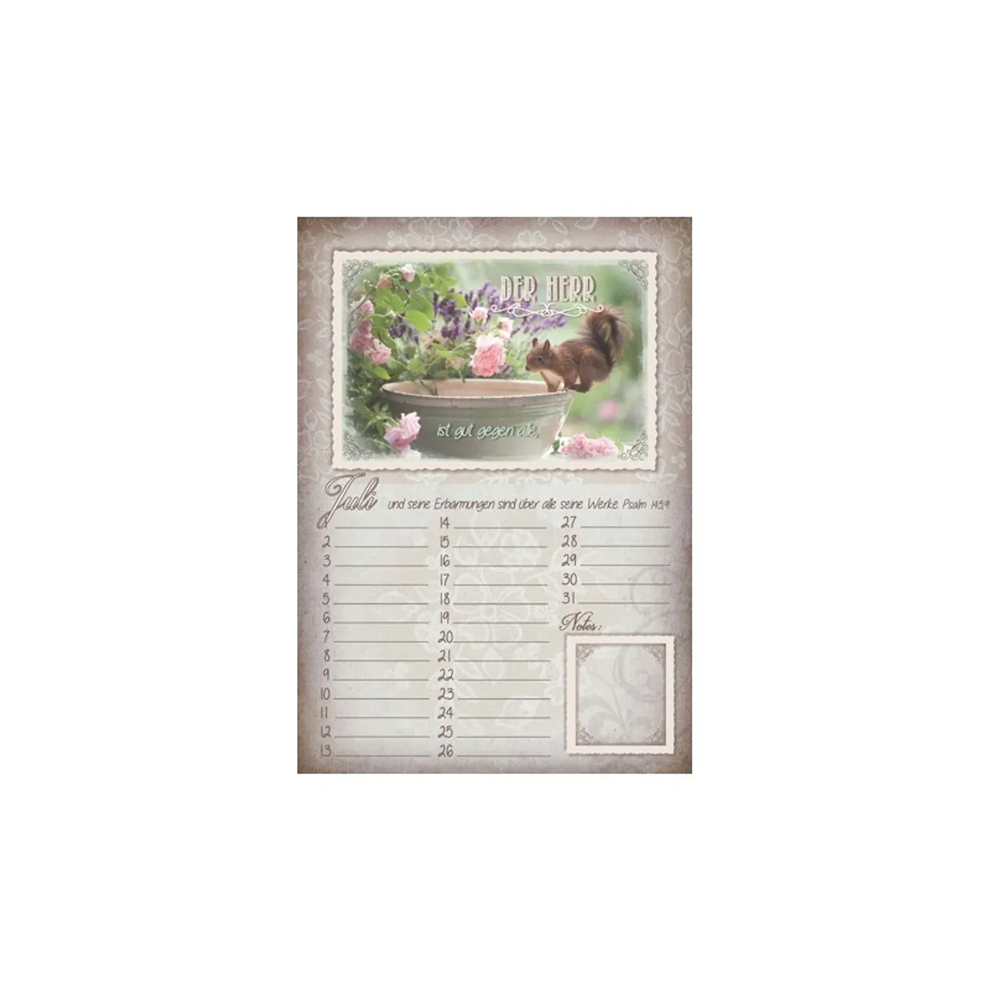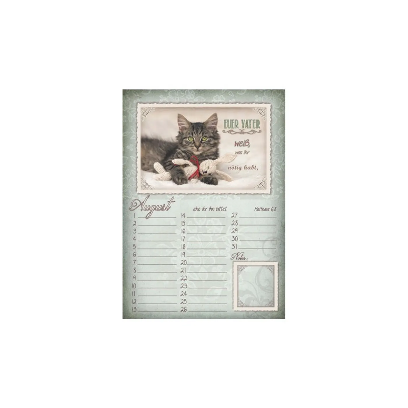 Besonders gefallen mir die Bibelverse, zudem sind aber auch die Fotos sehr gut ausgewählt. Der Kalender ist in schönen Farben gehalten.