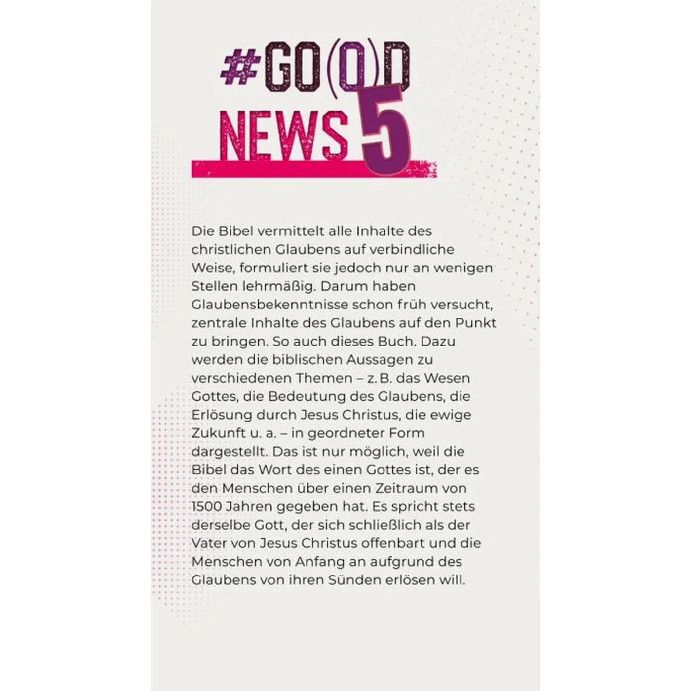 Die Bibel vermittelt alle Inhalte des christlichen Glaubens auf verbind-liche Weise, formuliert sie jedoch nur an wenigen Stellen lehrmäßig. Darum haben Glaubensbekenntnisse schon früh versucht, zentrale Inhalte des Glaubens auf den Punkt zu bringen. So auch dieses Buch. Dazu werden die biblischen Aussagen zu verschiedenen Themen – z.B. das Wesen Gottes, die Bedeutung des Glaubens, die Erlösung durch Jesus Christus, die ewige Zukunft u. a. – in geordneter Form dargestellt. Das ist nur möglich, weil die Bibel das Wort des einen Gottes ist, der es den Menschen über einen Zeitraum von 1500 Jahren gegeben hat. Es spricht stets derselbe Gott, der sich schließlich als der Vater von Jesus Christus offenbart und die Menschen von Anfang an aufgrund des Glaubens von ihren Sünden erlösen will.