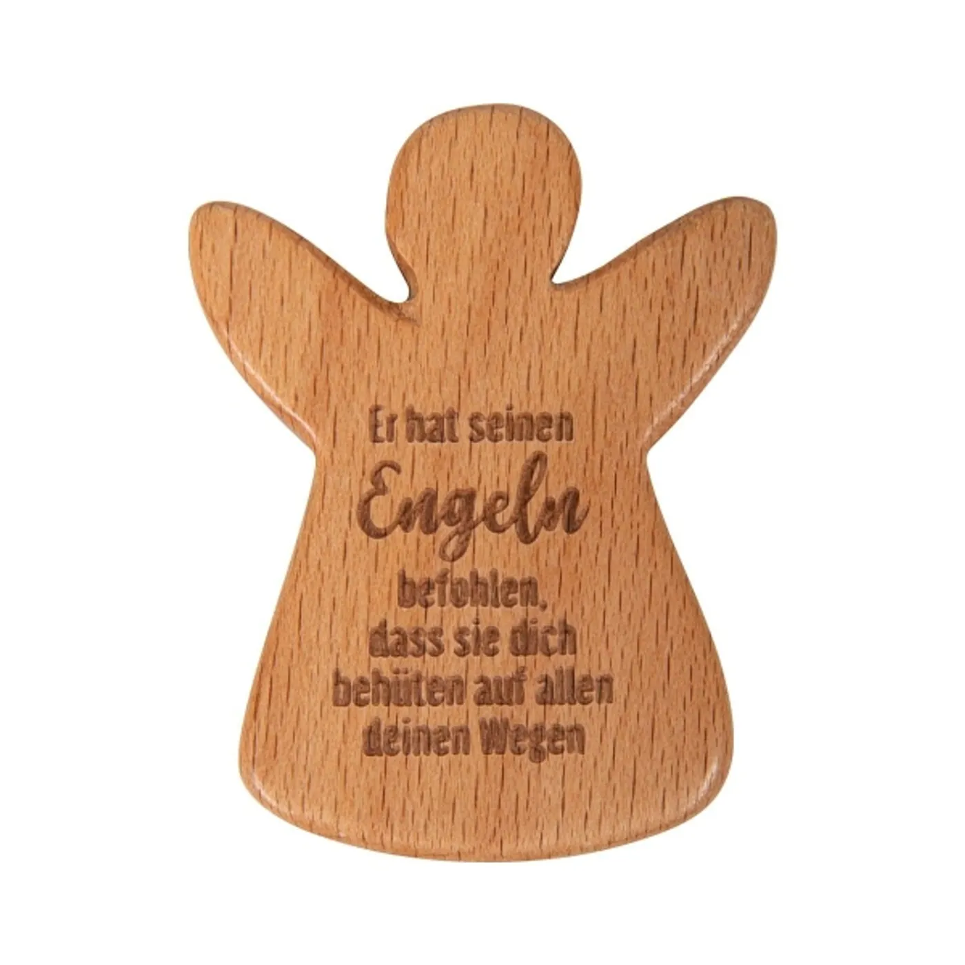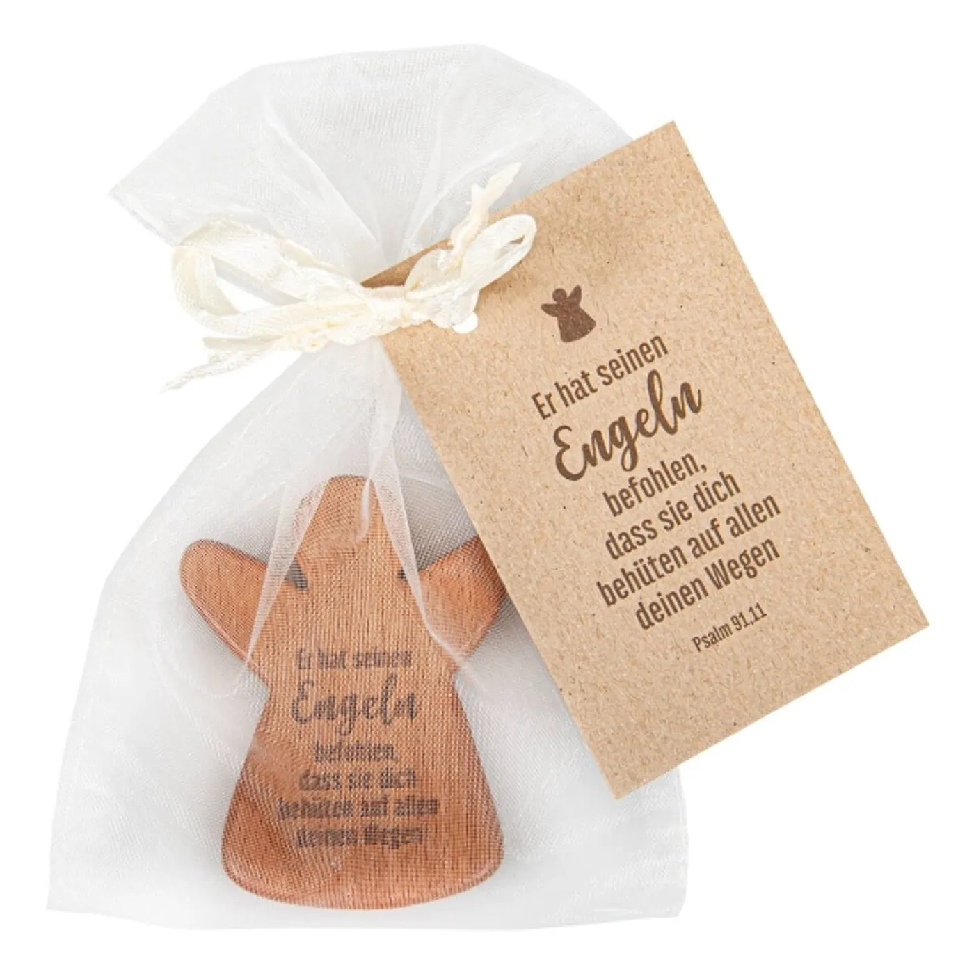 Der kleine Holzengel liegt angenehm warm in der Hand und eignet sich perfekt als täglicher Begleiter, Glücksbringer oder als Symbol der Verbundenheit. Auf dem Engel ist der ermutigende Bibelvers aus Psalm 91,11 eingraviert: