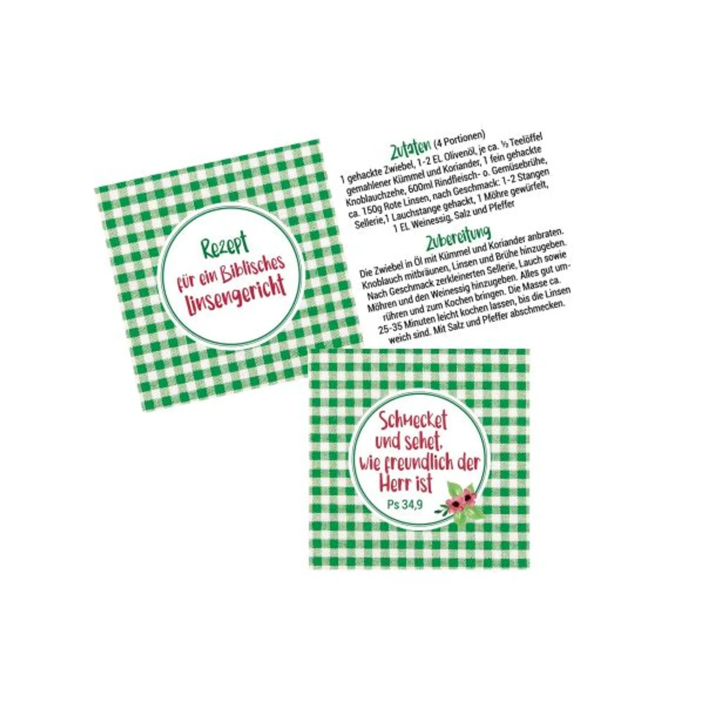 Die Rückseite enthält ein Rezept für ein Biblisches Linsengericht.