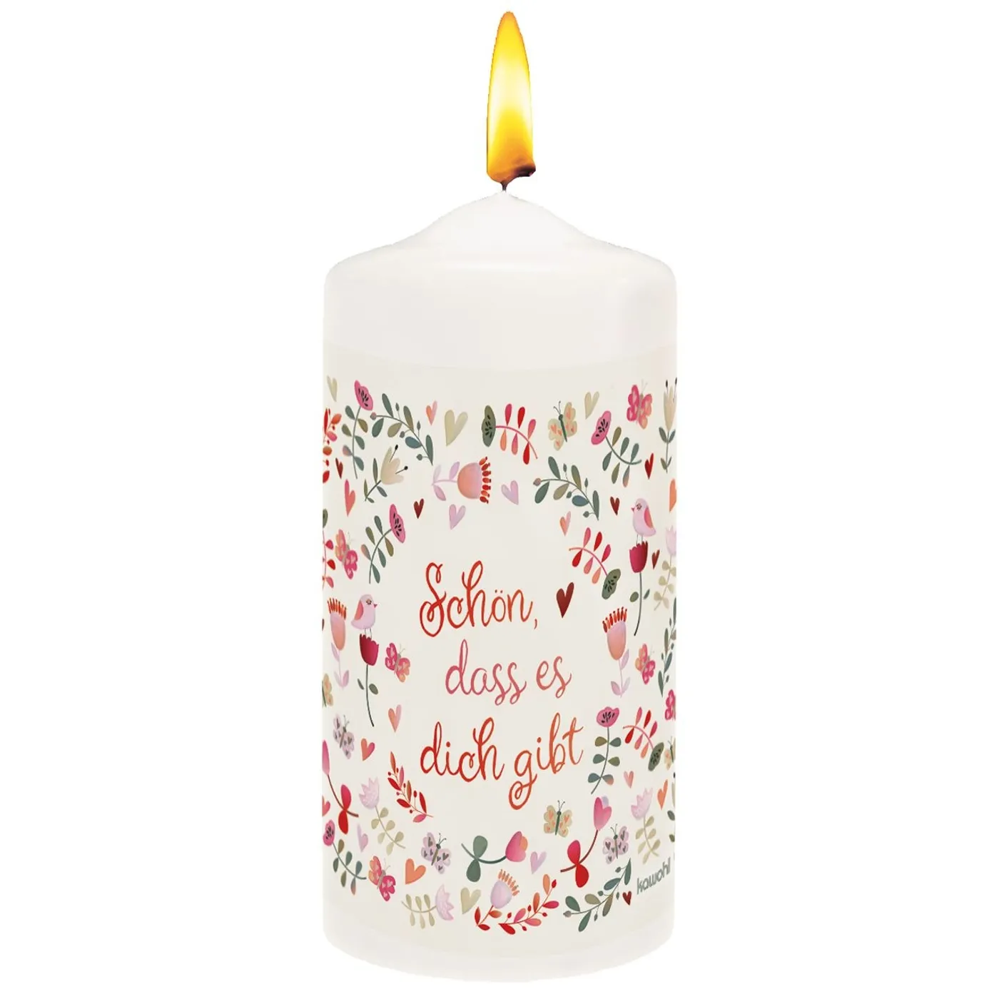 Kerze mit liebevoller Zusage und verspieltem Blumenmotiv