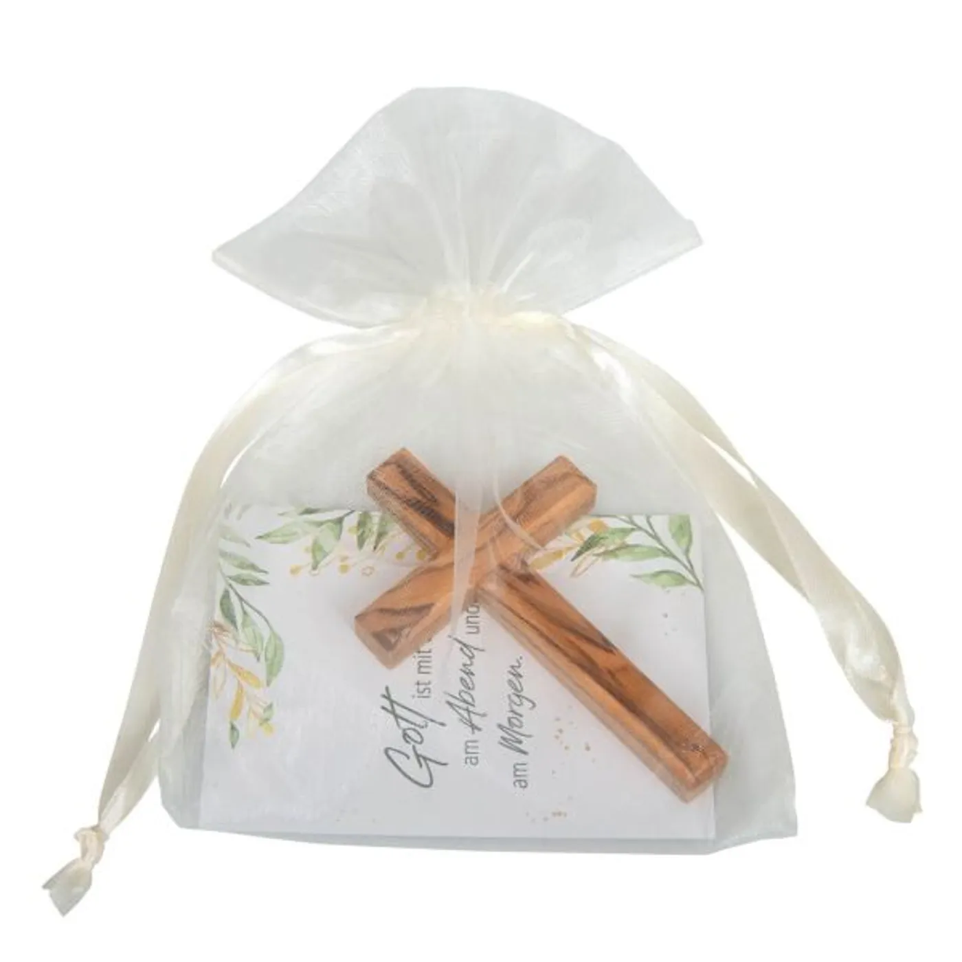 Schönes kleines Kreuz aus Olivenholz, fertig zum Verschenken verpackt im Organzabeutel.