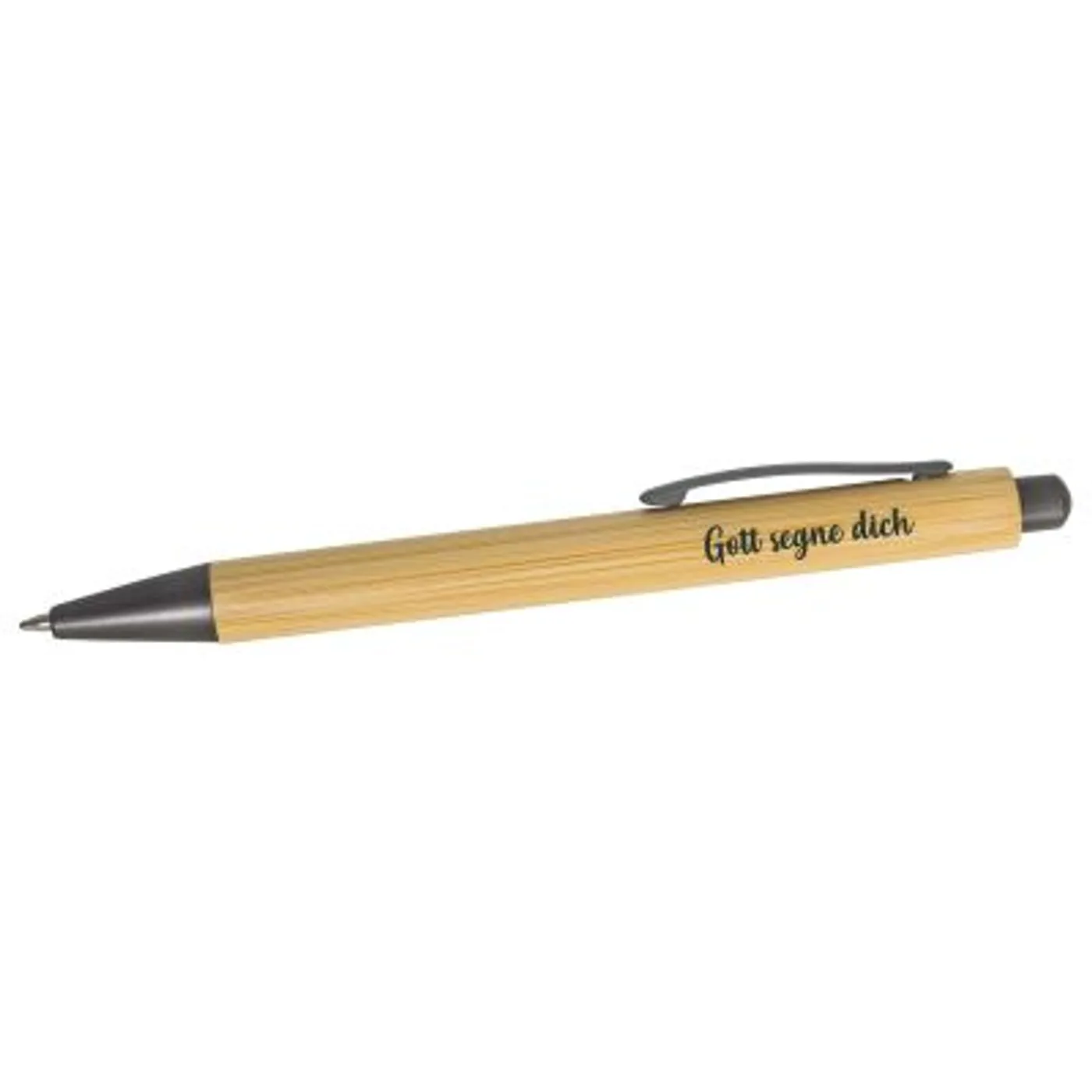 Umweltfreundlicher Kugelschreiber mit Bambusgehäuse, bedruckt mit freundlichem Vers „Gott segne dich“. Drücker, Metallclip und Spitze dunkelgrau. Minenfarbe: blau, verpackt in farblich passendem Pappetui