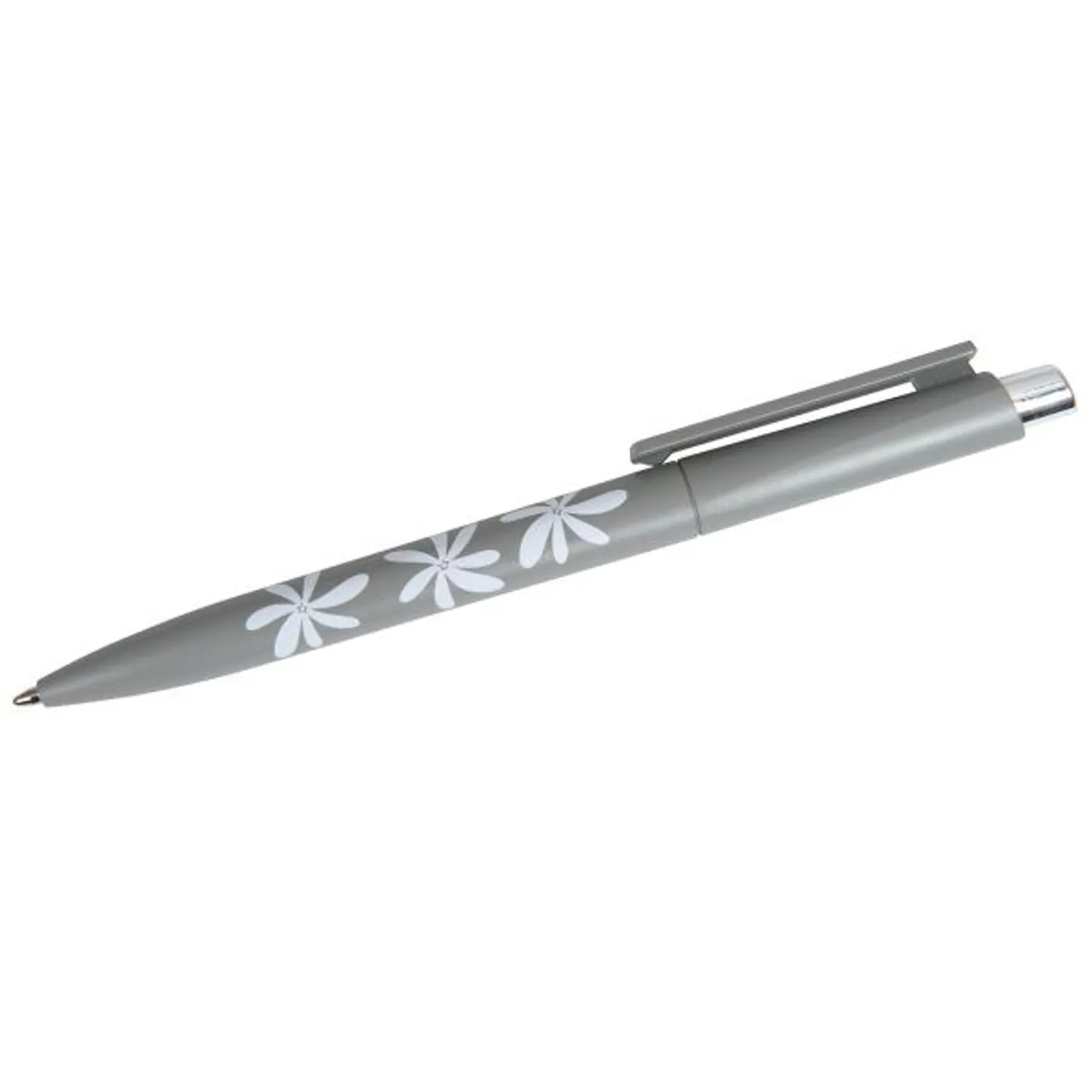 Tolle Ergänzung zur Serie: grauer Marken-Kugelschreiber, mit Schriftzug "blessed" auf dem Clip. Der Schaft ist rundum bedruckt mit weißen Blumen