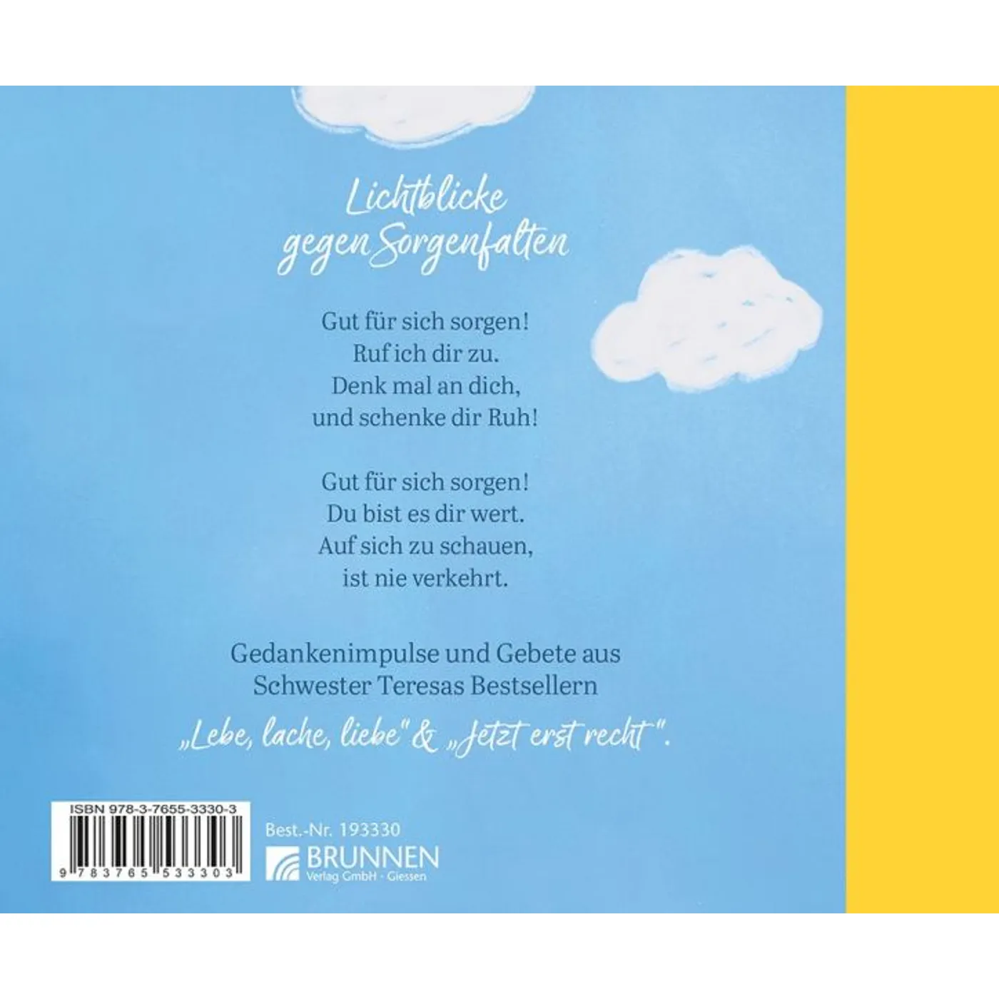 In diesem Buch vereint Schwester Teresa Zukic kluge Gedanken, berührende Texte, Gedichte, Anekdoten und kleine Weisheiten, die nicht belehren, sondern begleiten. Die Texte laden zum Lächeln ein – manchmal auch zum Lachen –, aber sie verschweigen die Schwere des Lebens nicht. Im Gegenteil: Sie nehmen Sorgen ernst, geben ihnen Raum, aber schenken gleichzeitig neue Perspektiven. Sie machen Mut, sie tragen, sie verstehen – und sie erinnern liebevoll daran, dass das Leben schön ist, auch mitten im Chaos. Und dass es gut ist, für sich selbst zu sorgen – mit einem offenen Herzen und einem dankbaren Blick.