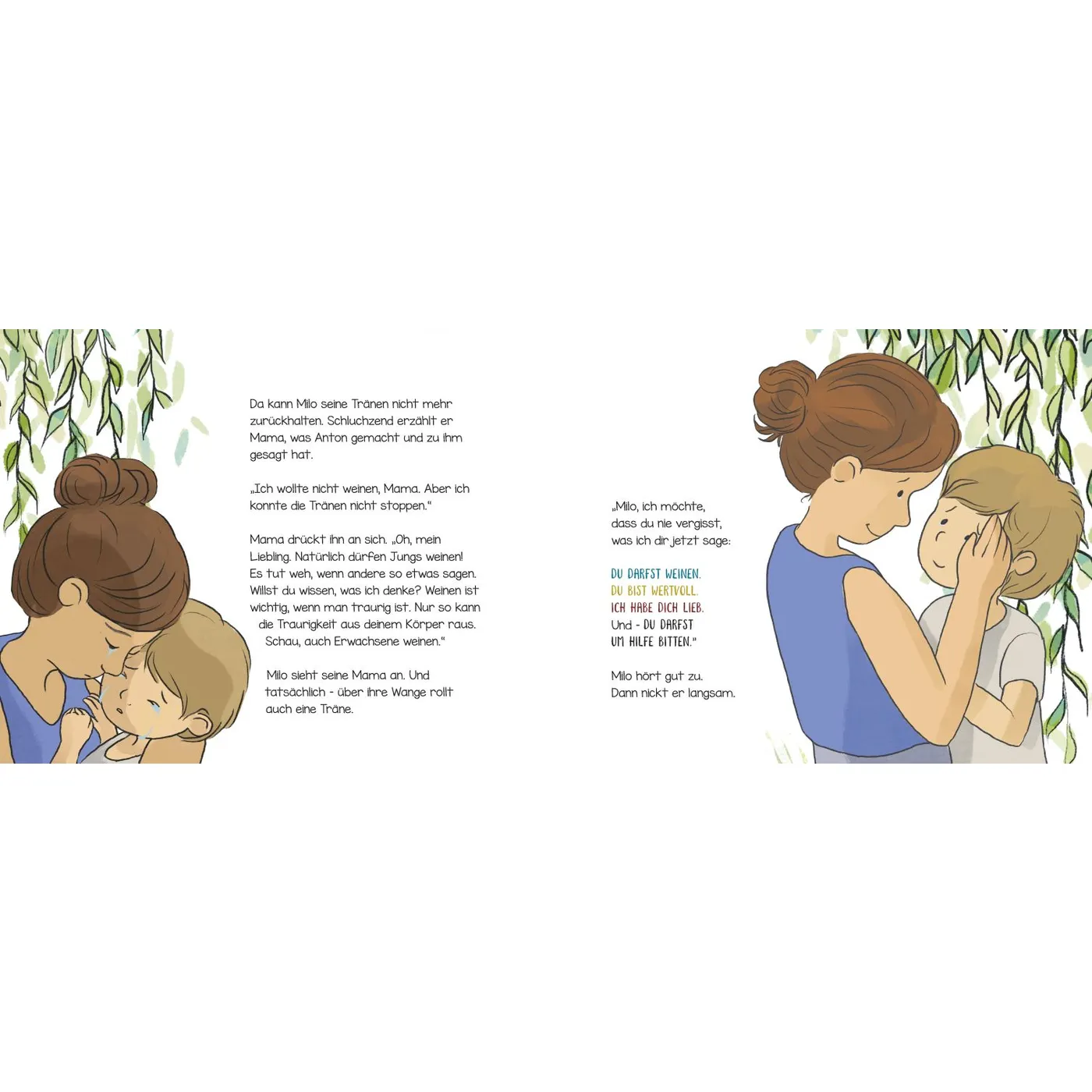Milo wird im Kindergarten von Anton geärgert und hört den Spruch „Jungs weinen nicht“. Als er nachmittags mit Mama darüber spricht, lernt er wichtige Wahrheiten und darf wissen, dass es gut ist, seine Gefühle zuzulassen. Dazu bastelt Mama mit ihm ein Armband, damit er sich auch im Kindergarten daran erinnern kann, dass er geliebt und wertvoll ist.