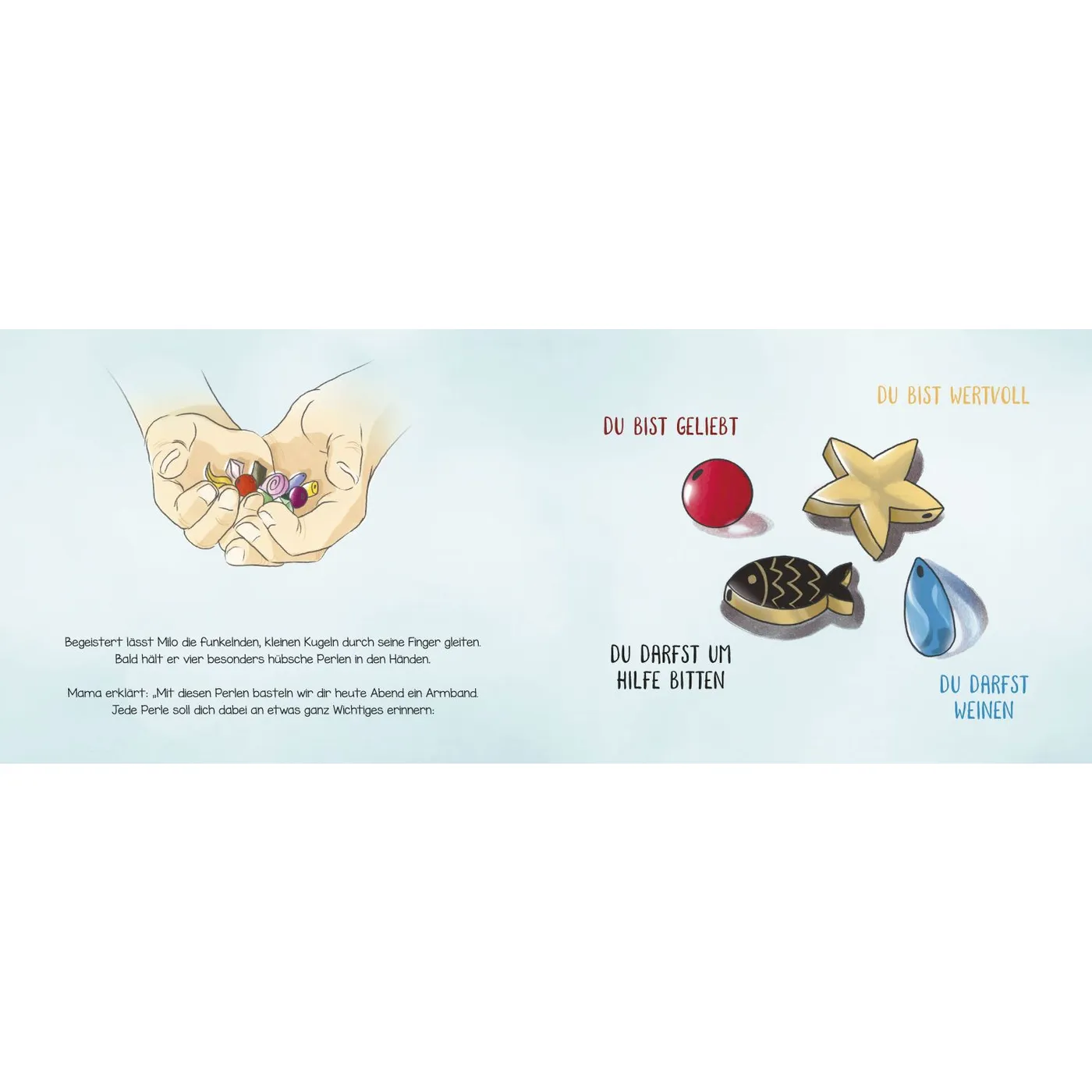Die Gefühle sind toll beschrieben, sodass auch Kinder sie schon begreifen und nachvollziehen können. Die Idee, ein Perlenarmband zu machen, um dem Kind die wichtigen Botschaften „Du bist geliebt“, „Du bist wertvoll“, „Du darfst um Hilfe bitten“ und „Du darfst weinen“ zu verdeutlichen und als Erinnerung mitzugeben, finde ich wirklich toll. Ich denke, ich werde das so ähnlich mit meinen Kindern umsetzen.