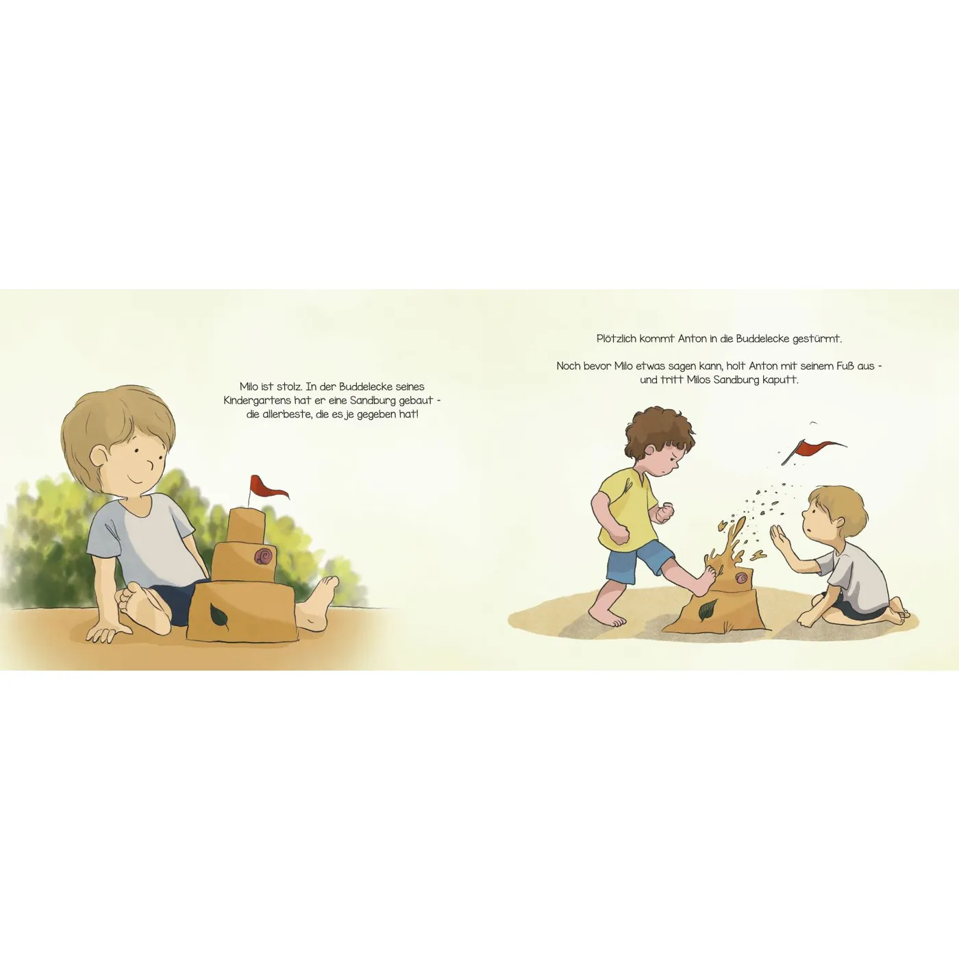 Milo ist ein Kindergartenkind und spielt gerne im Sand. Doch plötzlich kommt Anton und macht seine Burg kaputt. Milo kommen die Tränen, aber Anton sagt: Jungs weinen nicht!