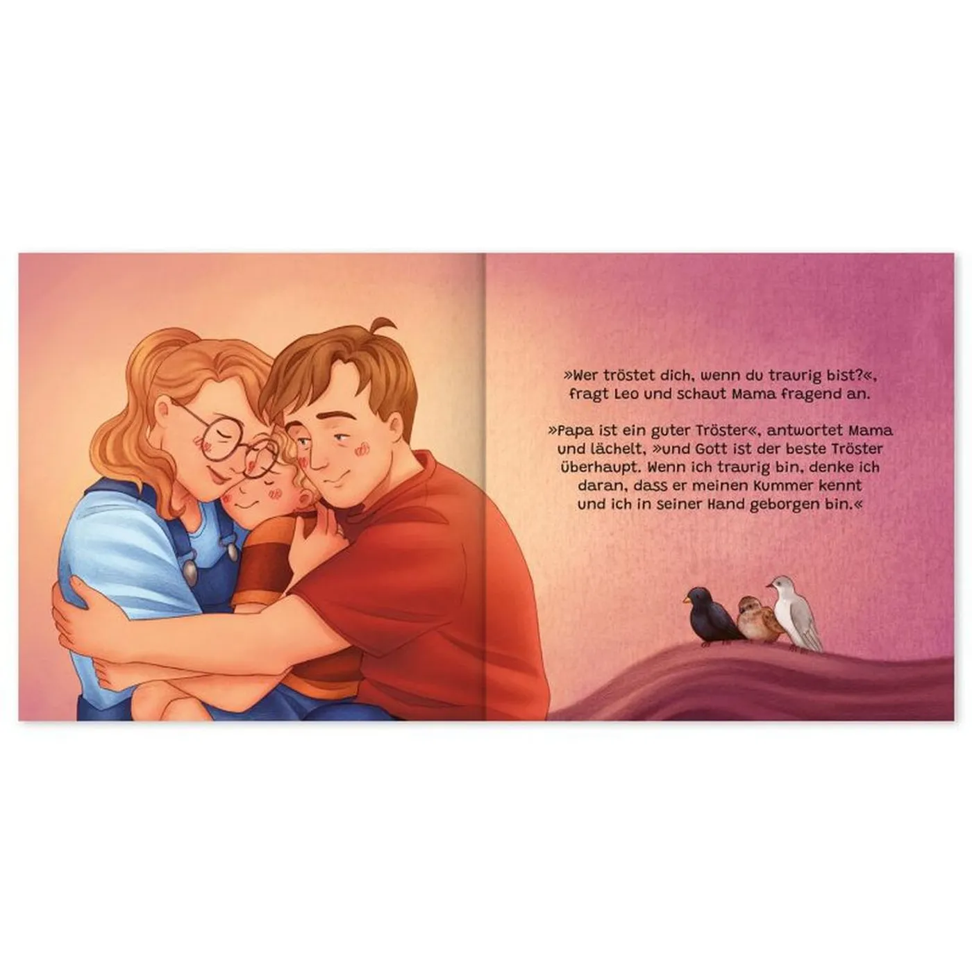 Ich finde es wichtig, dass Trauer thematisiert wird, denn auch Kinder empfinden sie. Hier wird sie kindgerecht angesprochen und ein wenig erklärt. Zudem gibt es neben dem Trost durch die Mama auch den Hinweis auf Gottes tröstendes Wesen.