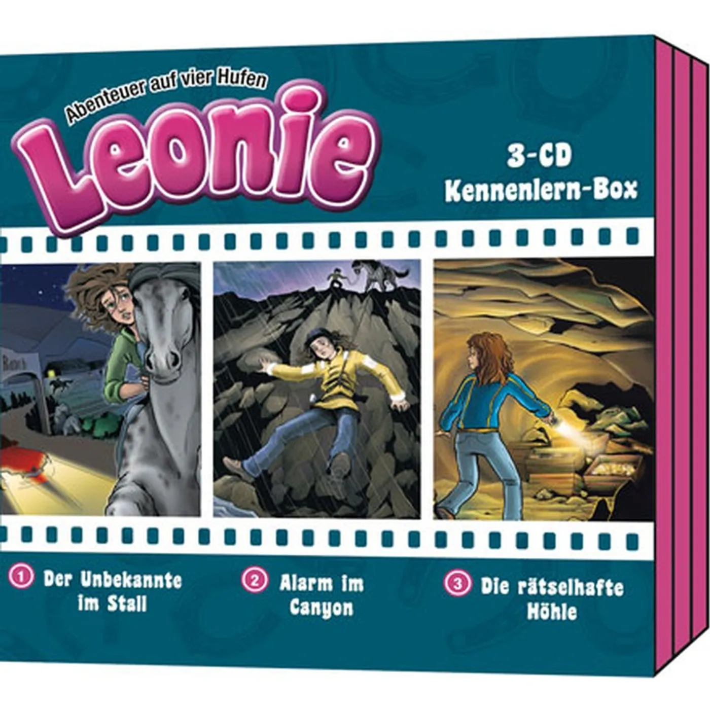 Diese Box enthält die ersten drei "Leonie- Abenteuer auf vier Hufen" Geschichten. Jede dieser Cd‘s kann problemlos für sich alleine und ohne jegliche Vorkenntnisse angehört werden. Der Erzähler gibt jeweils am Anfang einen kurzen Überblick mit den nötigsten Informationen. Dennoch haben wir es sehr genossen, die Serie direkt von Anfang an beginnen zu können. So haben wir erfahren wie es dazu kam, dass Leonie nach Amerika umziehen musste. Auf der Farm von Doktor Hamilton lernt sie ihre beiden Freundinnen Grace und Tiffy kennen und erlebt mit ihnen so manch aufregendes Abenteuer.