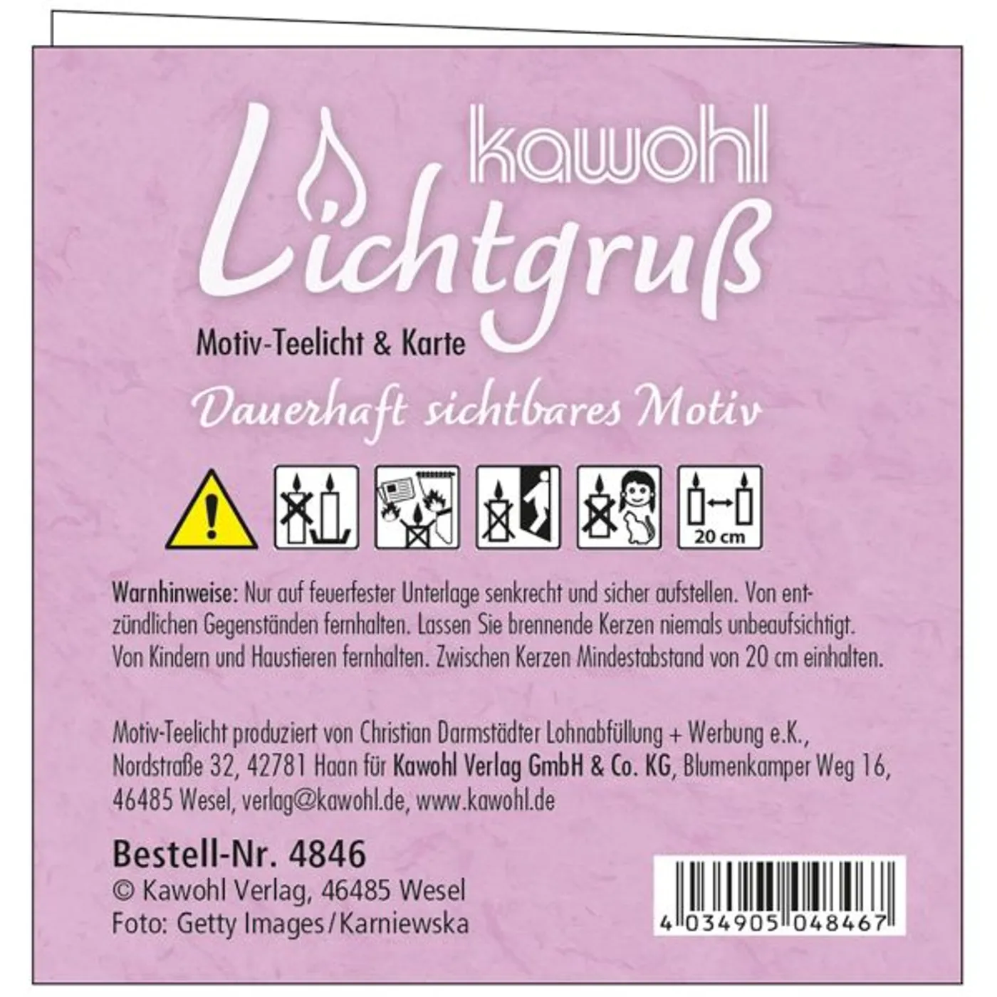 Ein kleiner Lichtgruß mit einer passenden Faltkarte (Format 9 x 9 cm). Das Teelicht ist auf besondere Weise veredelt. Beim Abbrennen schwimmt die Botschaft auf dem flüssigen Wachs und bleibt so - bis auf ein kleines Loch um die Flamme herum - sichtbar.