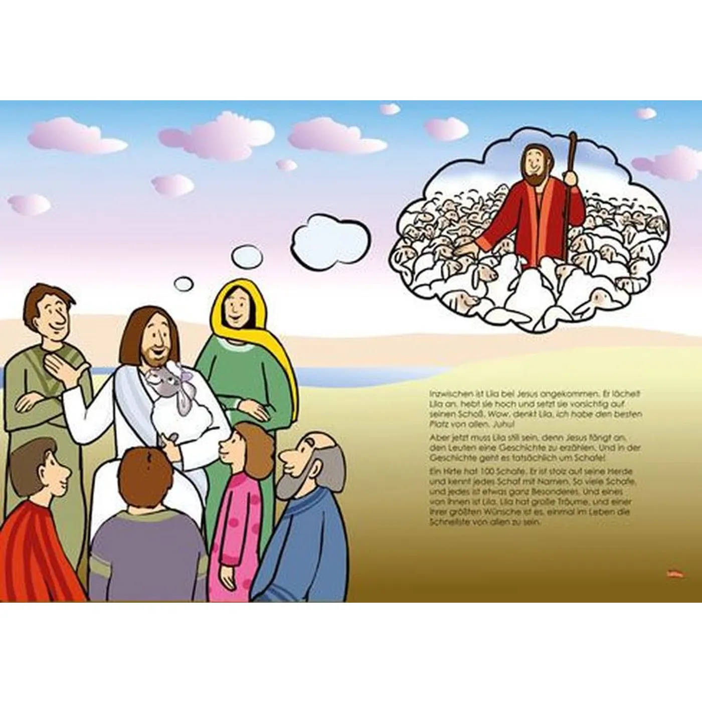 Das Schaf Lila liebt Abenteuer. Diese findet sie auf ihren Reisen mit Jesus. In jeder der fünf Geschichten geht einer ihrer Träume in Erfüllung. Ihr Traum, besonders schnell zu sein, erfüllt sich im Gleichnis vom verlorenen Schaf. Ihr Traum, stark zu sein, erfüllt sich bei der Heilung an Bartimäus. Ihr Traum vom Fliegen erfüllt sich, als sie mit dem gelähmten Mann auf der Bahre durch das Dach ins Haus fliegt. Als Kapitänin segelt sie mit Jesus über den See Genezareth und ihr Wunsch, einmal ein Autogramm von einem berühmten Menschen zu bekommen, erfüllt sich, als Jesus die Kinder segnet. Das Schaf Lila bringt uns die biblischen Geschichten mit Humor und Tiefgang näher.