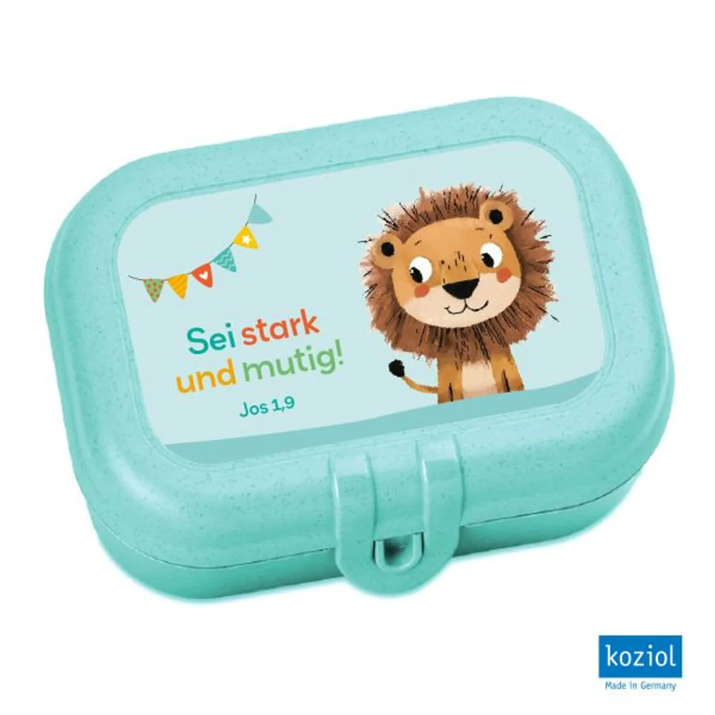 Sie ist ein praktischer Begleiter für Kindergarten, Schule oder Ausflüge, bedruckt im hochwertigen iMould-Verfahren mit Text "Sei stark und mutig! Jos.1,9". Dank Klickverschluss ist die Box leicht zu öffnen und zu schließen.