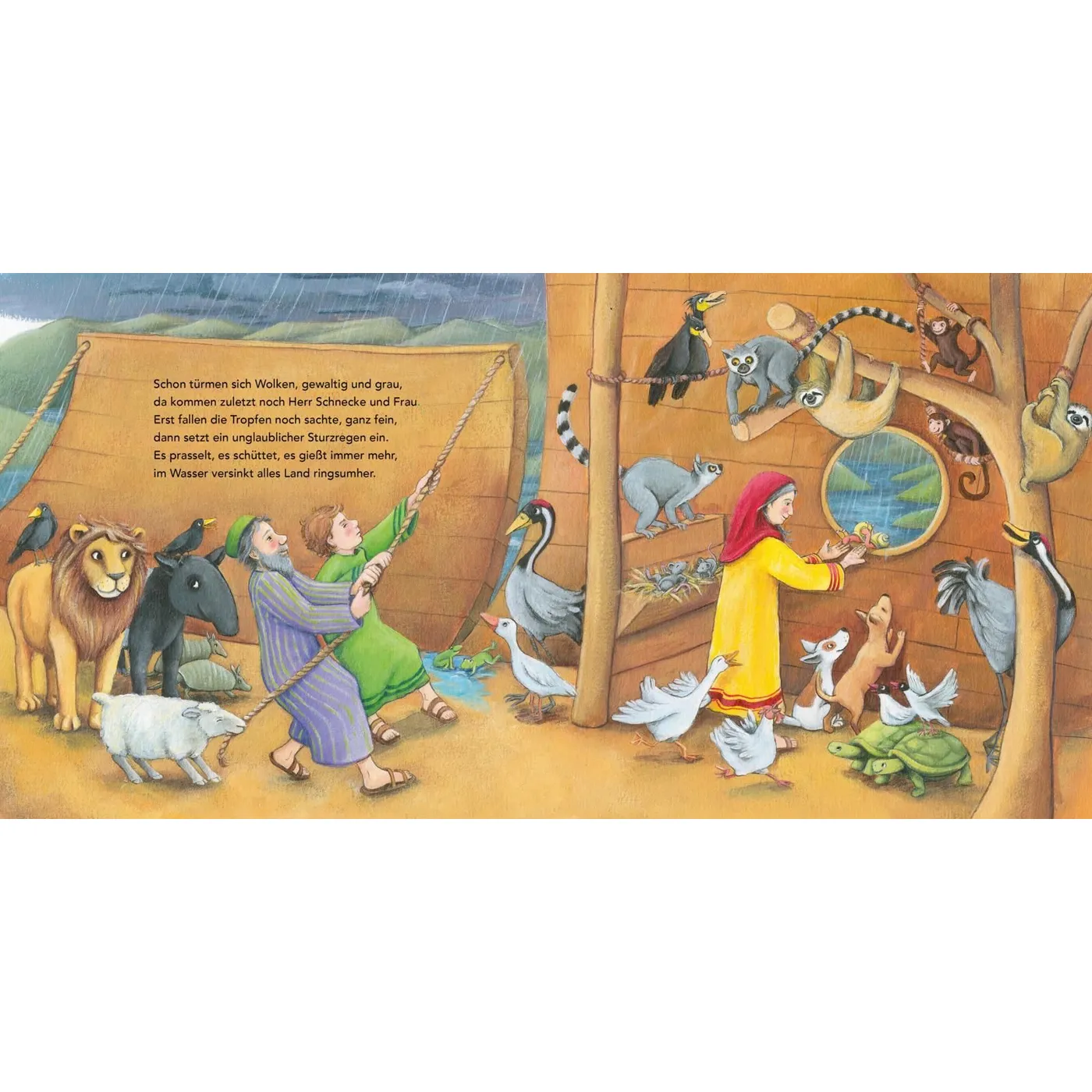 Die biblische Geschichte von Noah, der eine Arche für die Tiere baut. Das kleine Pappbilderbuch in Form der Arche Noah ist lebendig gereimt und liebevoll illustriert. Auf dem Cover gibt es ein Guckloch, durch das man in das Schiff hineinsehen kann. Für Kinder ab 18 Monaten geeignet.So sagt Gott zu Noah: „Dich will ich beschützen.Geh, bau eine Arche, die soll dir noch nützen.Deine Frau und die Kinder nimm auch mit hinein,dazu alle Tiere, von groß bis ganz klein.“Noah tut, was Gott sagt, der Bau geht voran,und seine drei Söhne, die packen mit an.