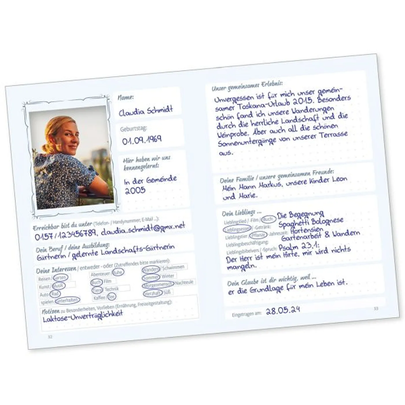 Entdecken Sie die Freude des Erinnerns mit unserem liebevoll gestalteten Freundebuch für Erwachsene. Auf 50 Doppelseiten können Sie die wichtigsten Eckdaten und Interessen Ihrer Lieblingsmenschen notieren. Halten Sie Ihre gemeinsame Geschichte und unvergessliche Momente fest. Ein wunderbares Geschenk für einen runden Geburtstag, für Arbeitskollegen zum Abschied, bei einem Umzug oder einfach für Sie selbst. Mit Geburtstagskalender, christlichen Texten von Doro Zachmann und Bibelversen.
